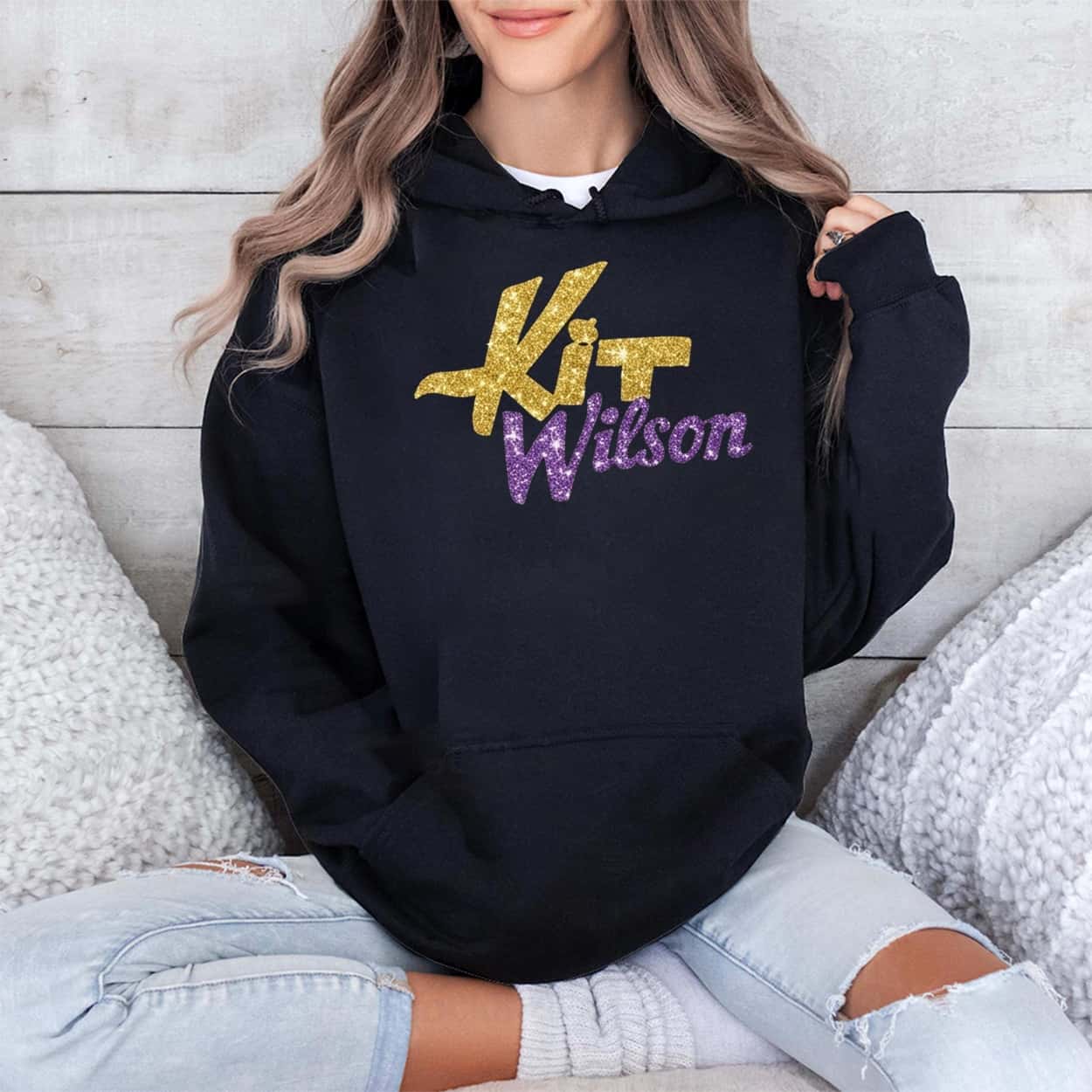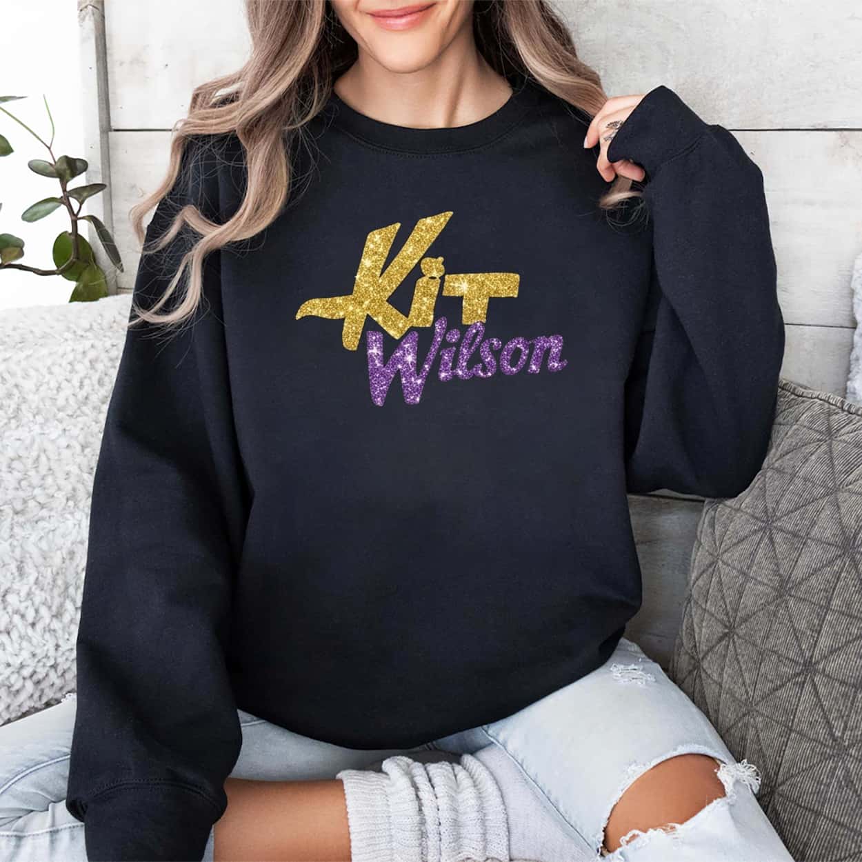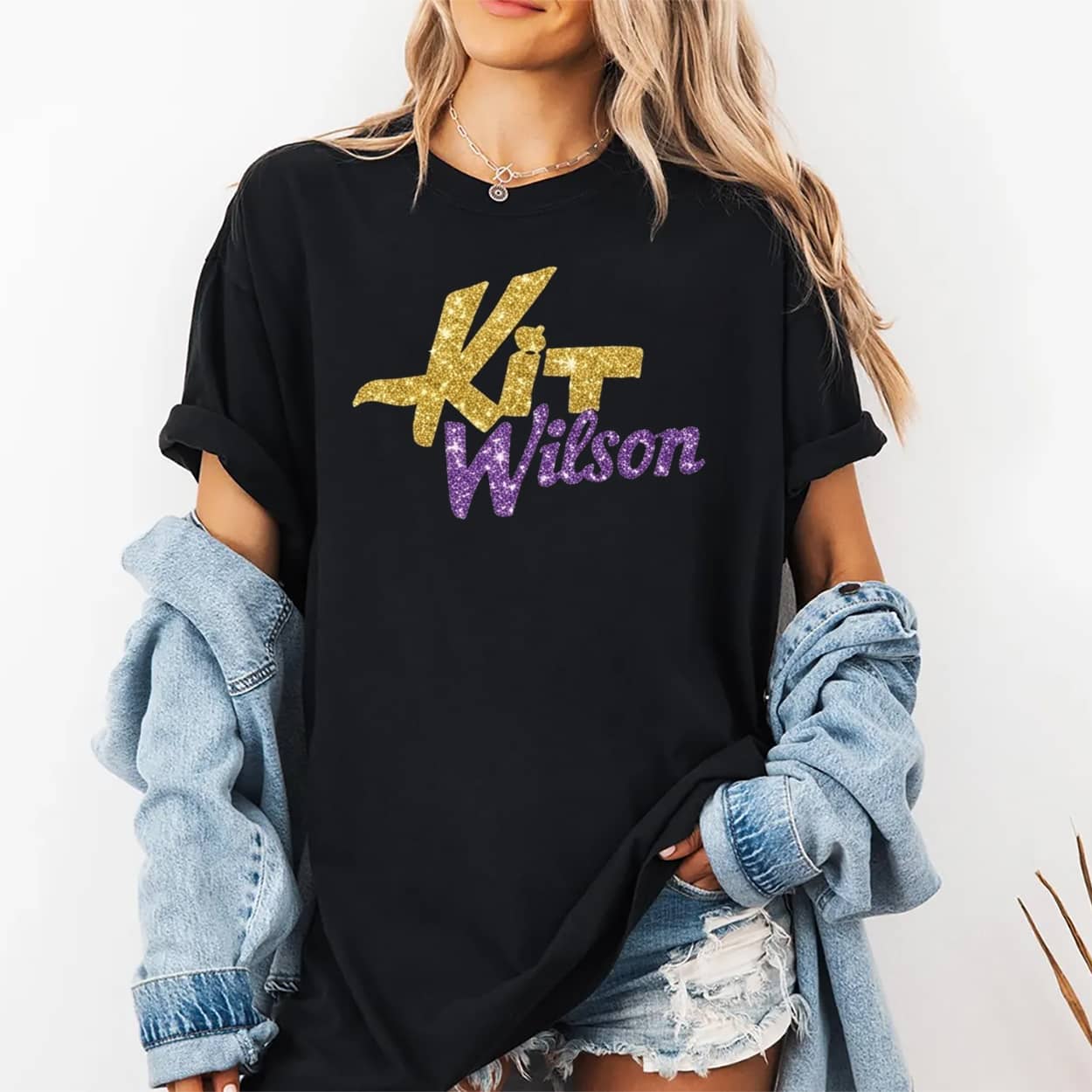 Step into the spotlight with a brilliant pop-culture crossover design. The Kit Wilson Hannah Montana Themed Shirt features a striking, centered graphic that perfectly mimics a legendary 2000s television logo. The name “Kit” is styled in a sparkling, textured gold-style font, while “Wilson” rests directly below in matching, glittering purple lettering. This sharp, nostalgic typography instantly creates an eye-catching, self-aware statement piece.