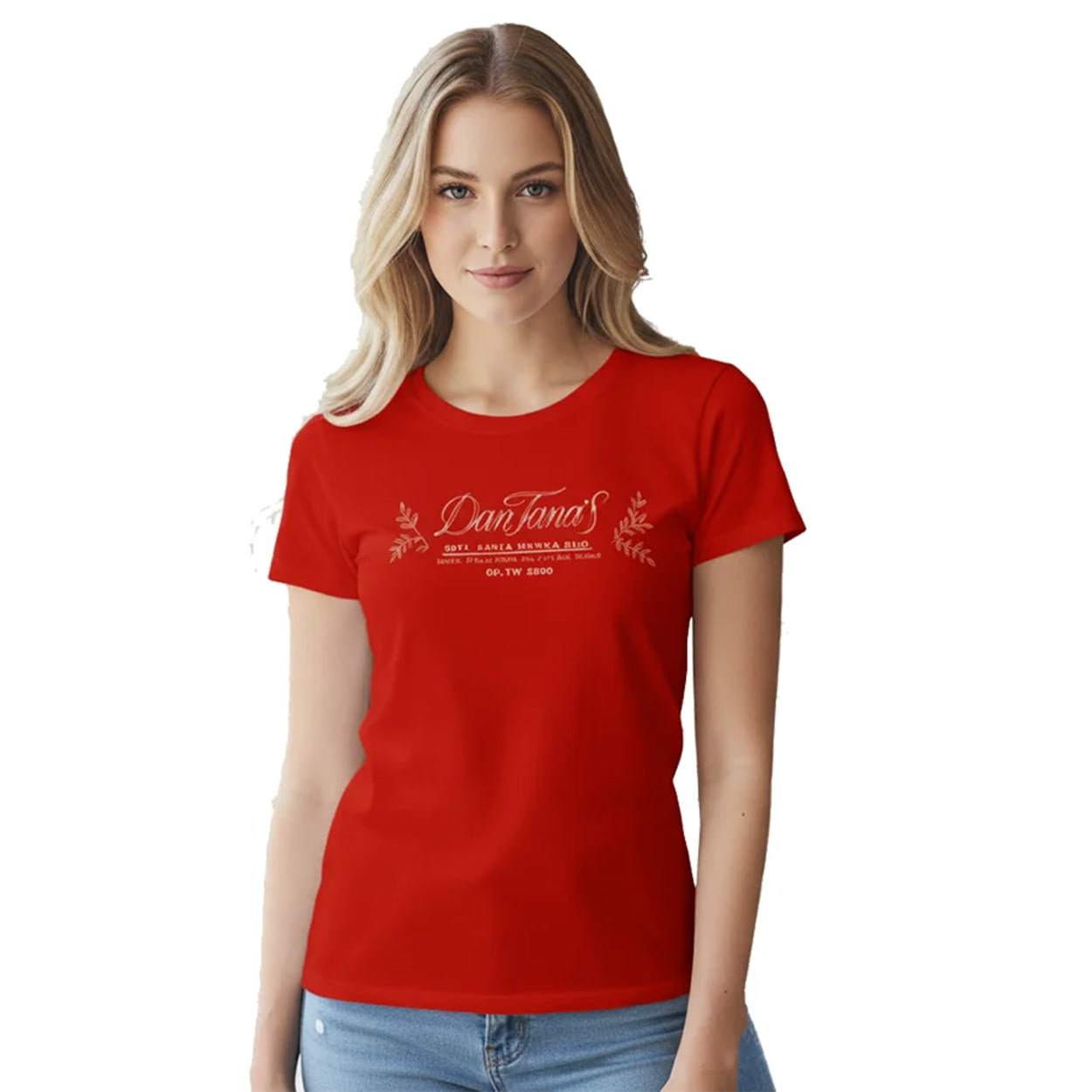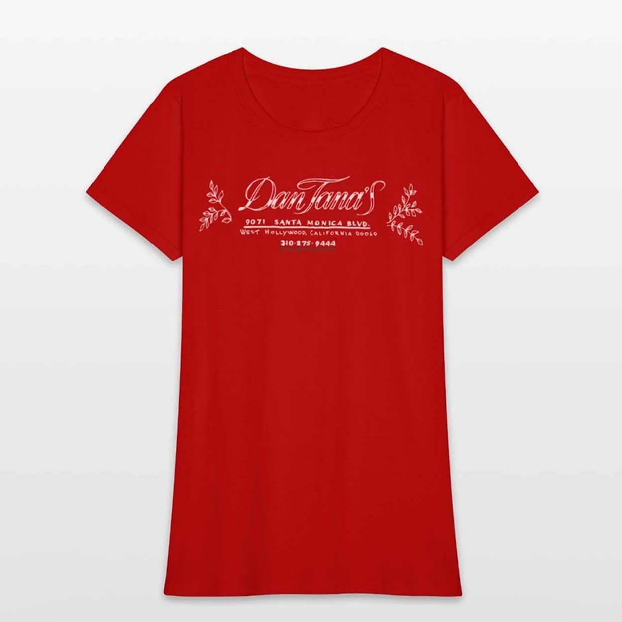 This t-shirt is a simple yet iconic piece of fan apparel. It features the classic white script logo of “Dan Tana’s,” the legendary Italian restaurant in West Hollywood, complete with its Santa Monica Blvd address and phone number printed underneath. The design is instantly recognizable to anyone familiar with Los Angeles landmarks or, more recently, fans of a certain hit streaming show.