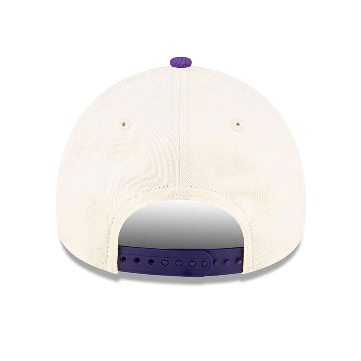 This cap is a structured baseball hat in the Lakers’ purple and gold colors, set against a cream/off-white crown. The main feature is the Lakers logo patch with the team name prominently displayed in Japanese Katakana script. The brim is a rich purple, maintaining the iconic team aesthetic. It features a classic snapback closure for an adjustable fit.