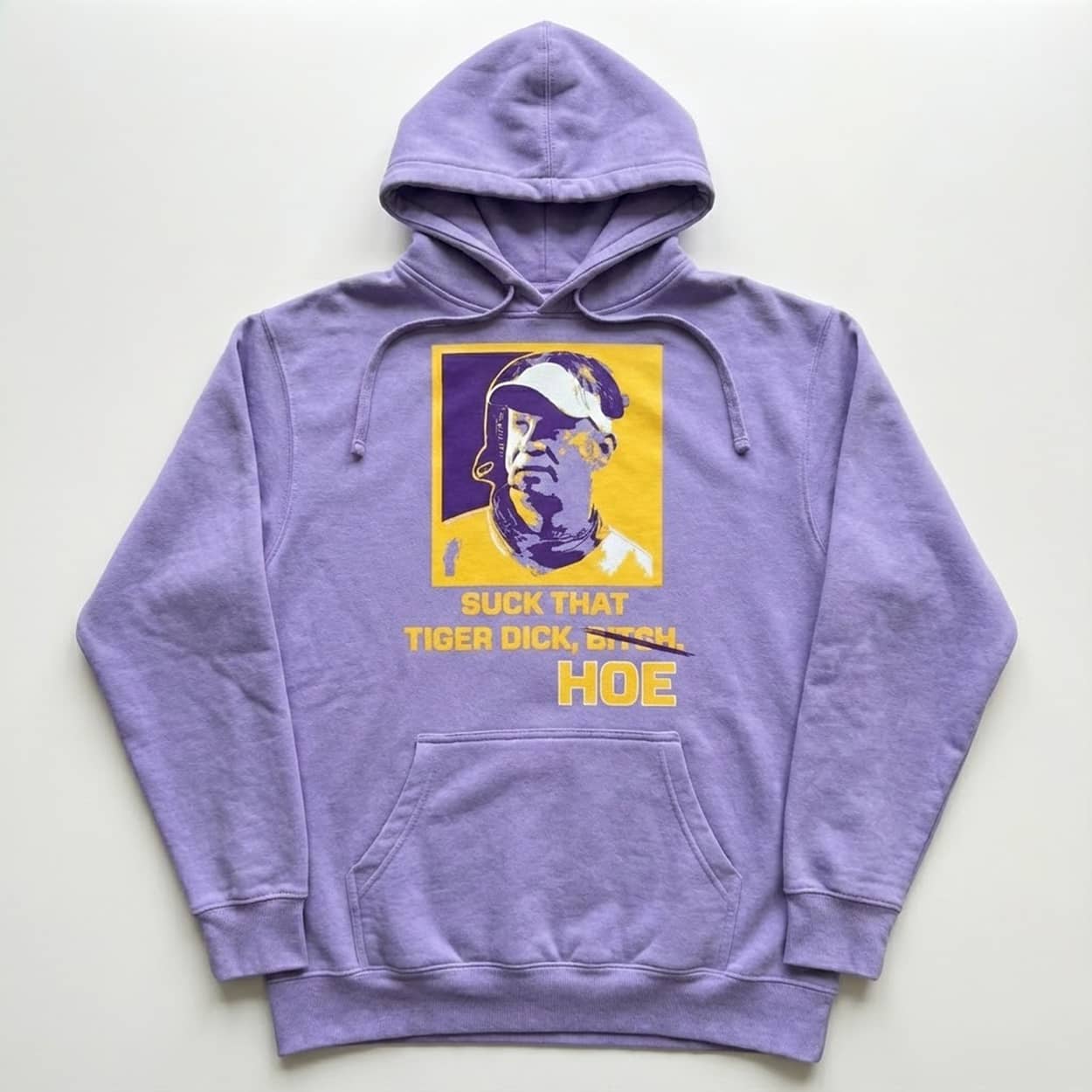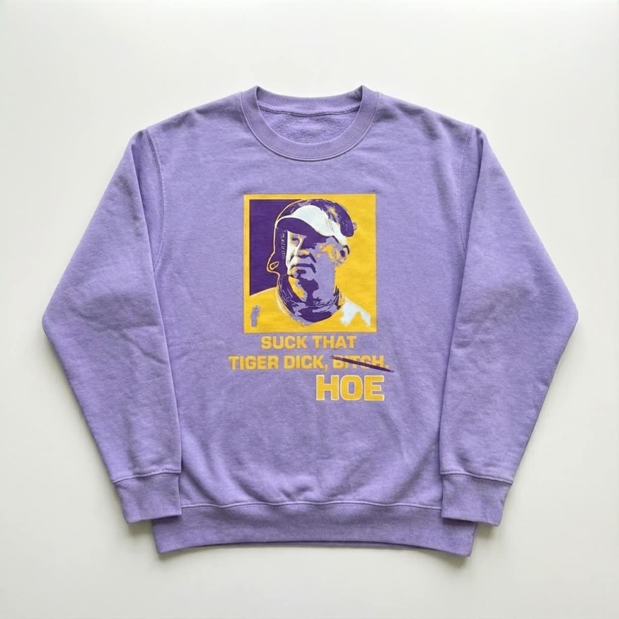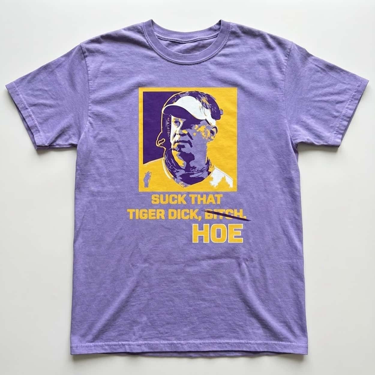 Dive into rivalry flair with the Lane Kiffin Suck That Tiger Dick Hoe Shirt. The design centers on a vibrant pop-art image of Kiffin in a cap against a yellow-purple background, overlaid with bold yellow text “SUCK THAT TIGER DICK, BITCH HOE” in a crossed-out style for dramatic emphasis, creating a satirical graphic that captures attention without extra logos.
