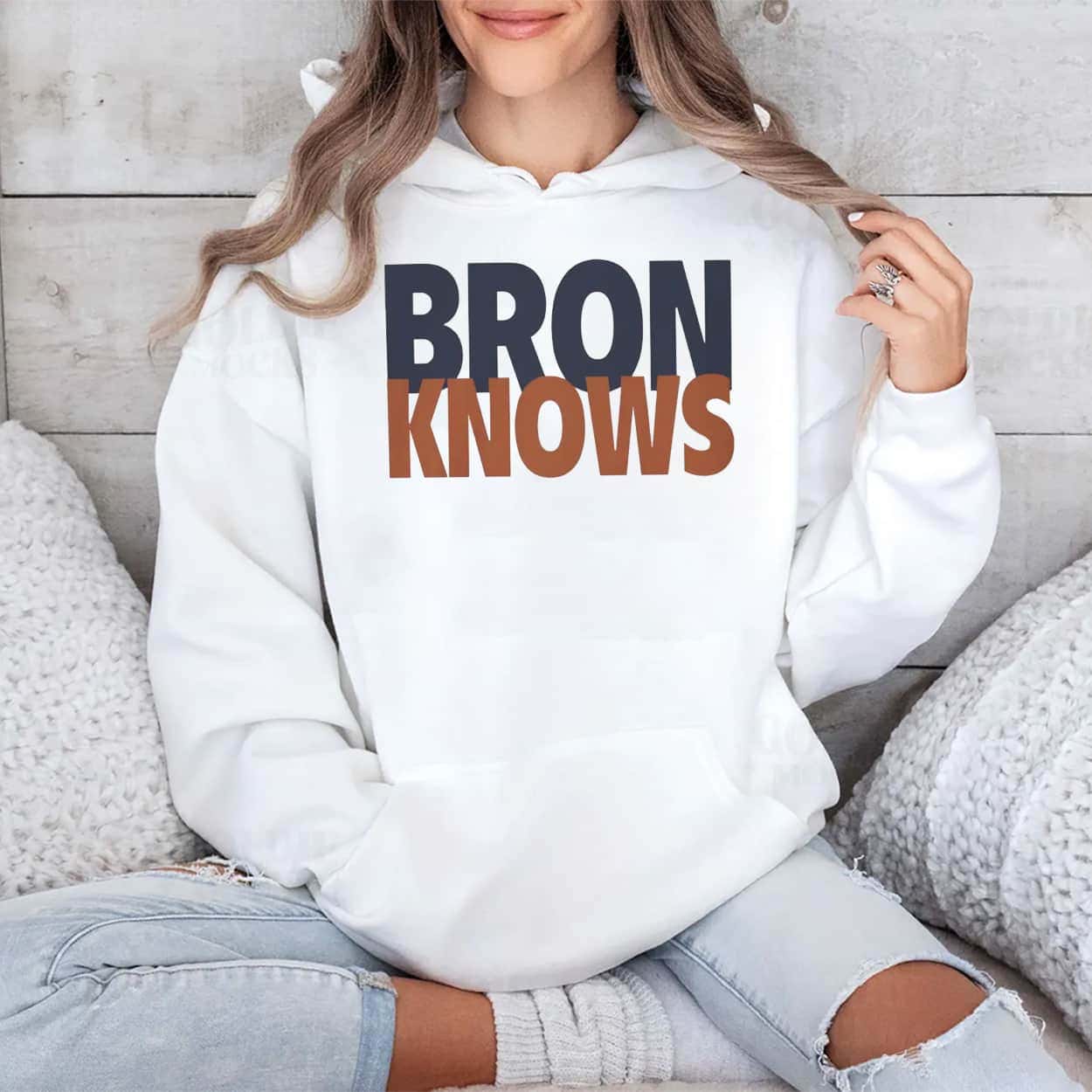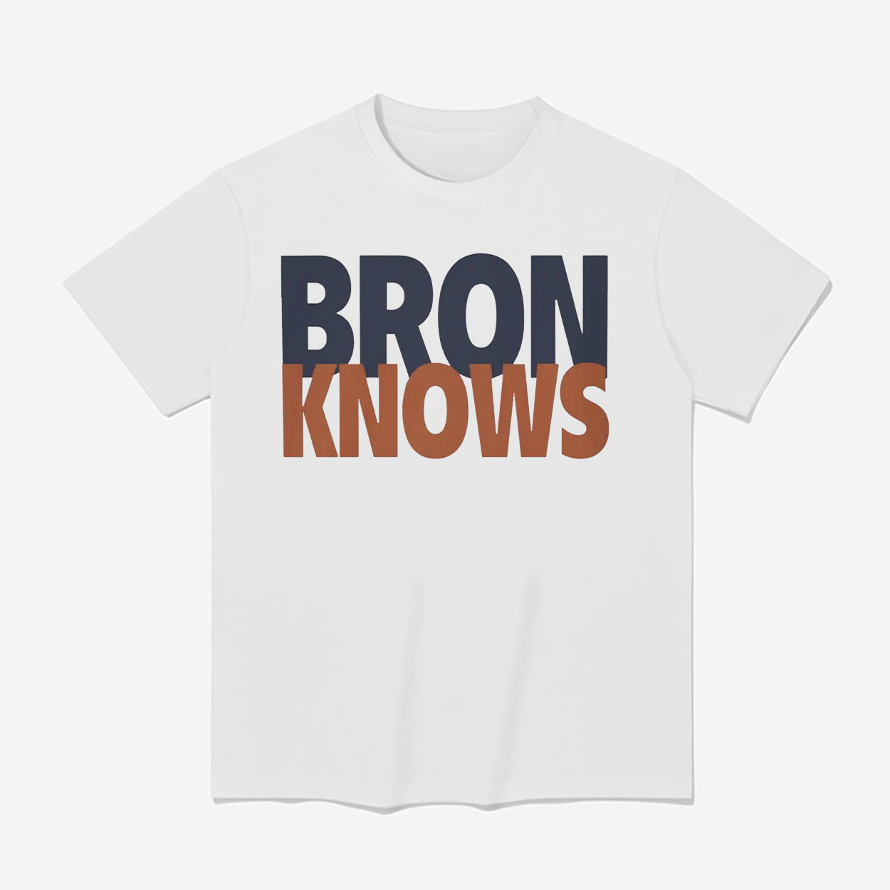 This t-shirt features the iconic phrase “BRON KNOWS,” split into two lines with a bold, color-blocked look. The clean, sans-serif font and contrasting colors give this piece a classic, retro athletic feel, making it a stylish and versatile addition to any fan’s wardrobe.