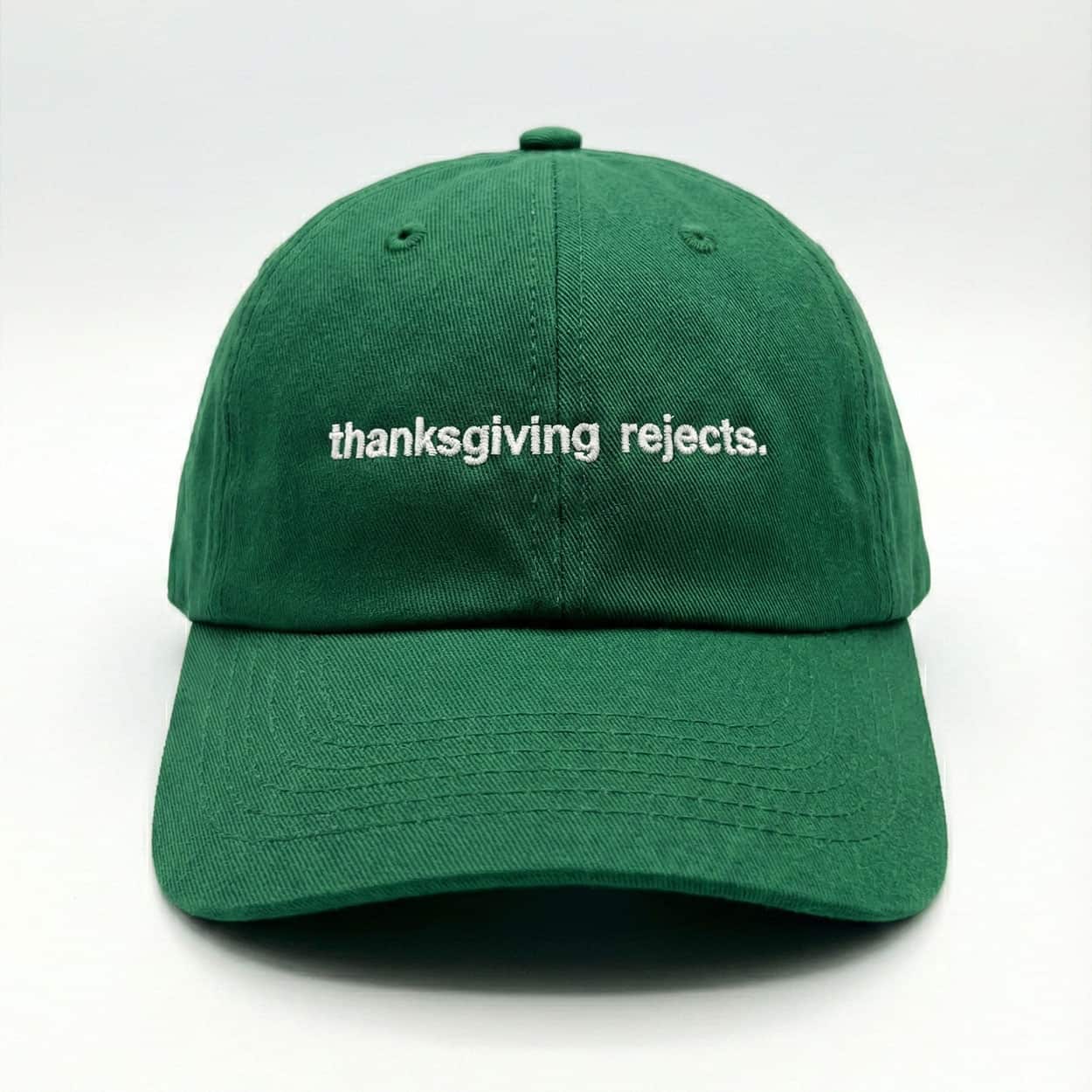 Channel rebellious holiday spirit with the Lena Dunham and Lily Allen Thanksgiving Rejects Hat. The design features “thanksgiving rejects.” in clean, lowercase white embroidery centered on the front panel, offering a minimalist yet provocative statement without additional graphics or logos.