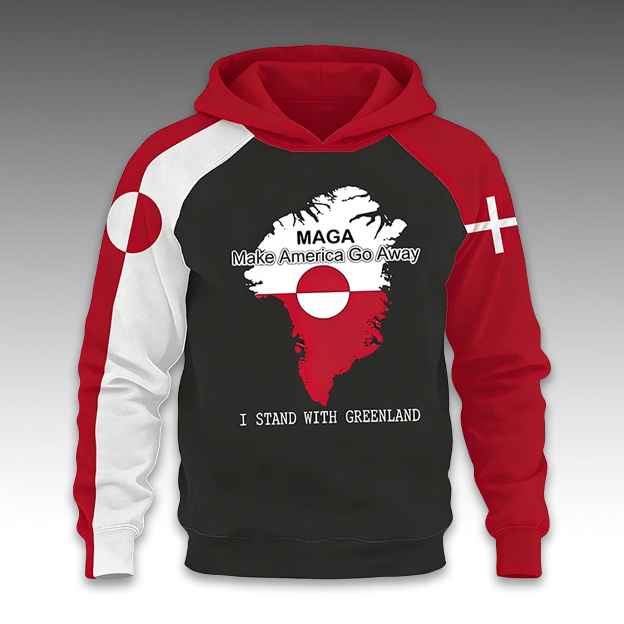 Make a fearless geopolitical statement with this striking protest jersey. The design centers on a detailed silhouette of Greenland, filled with the nation’s iconic red and white sun-horizon flag. Above the map, the acronym “MAGA” is cleverly repurposed to read “Make America Go Away,” while the bottom declaration “I STAND WITH GREENLAND” solidifies the message of solidarity. The look is completed with distinct sleeve designs featuring the Greenlandic flag on one side and the Danish flag on the other, symbolizing the island’s heritage and alliances.