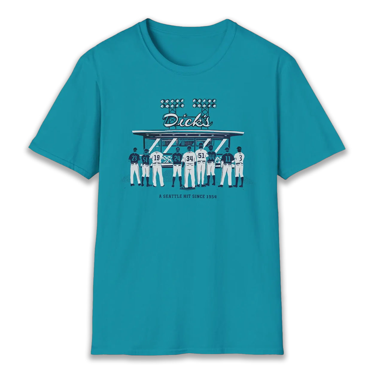 This shirt captures the heart of Seattle by combining two of the city’s most beloved institutions. The front features a beautifully illustrated, retro-style graphic of a Mariners team lineup, with iconic jersey numbers visible, standing outside the legendary Dick’s Drive-In. The entire scene is set under classic stadium lights, perfectly merging the ballpark atmosphere with the famous burger joint.