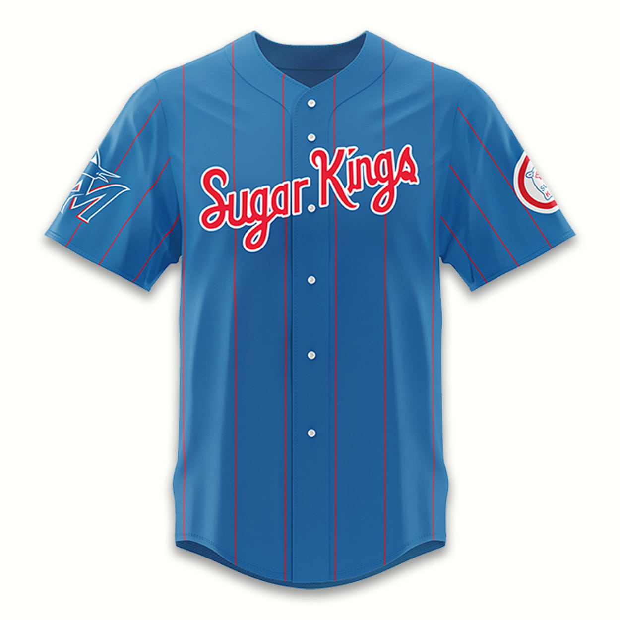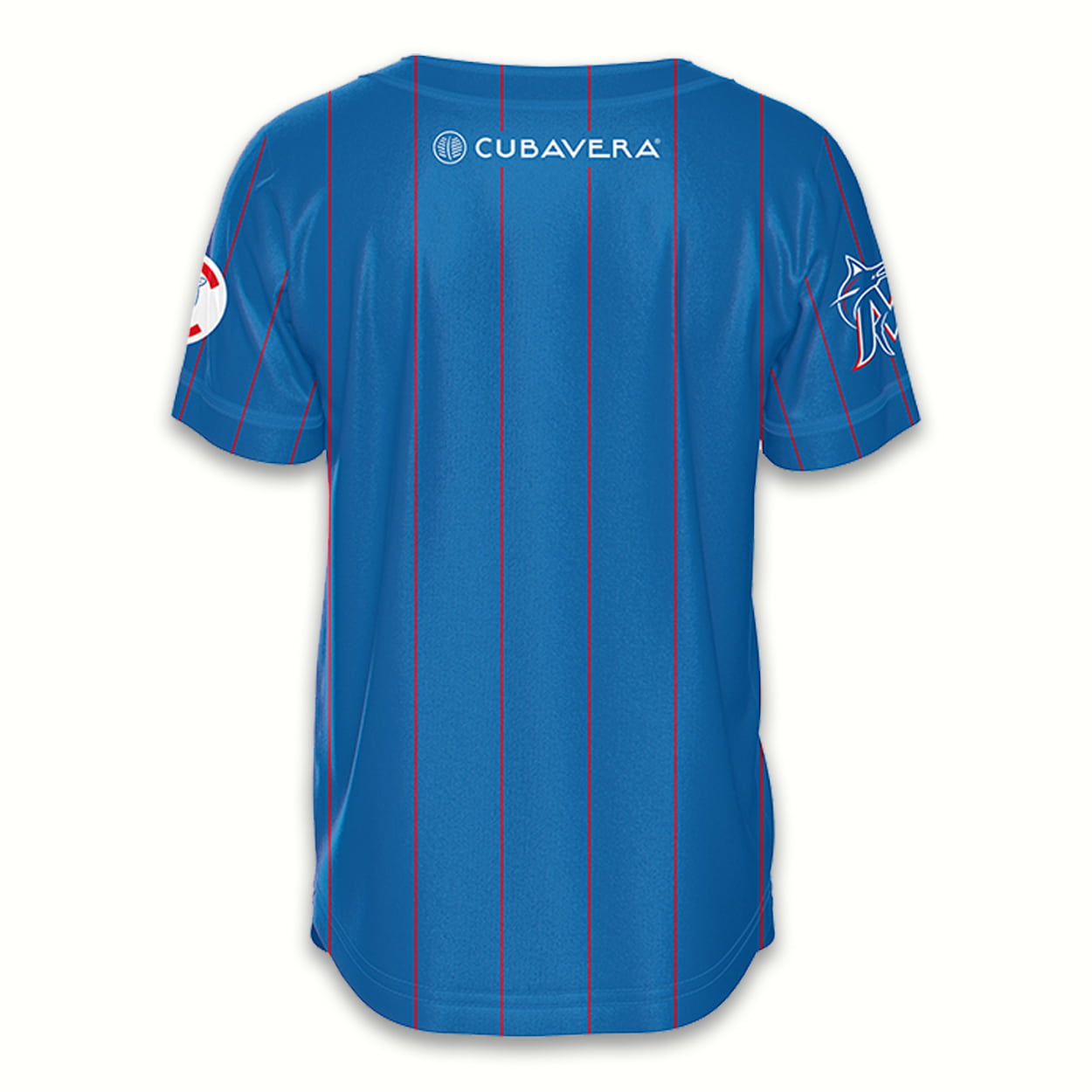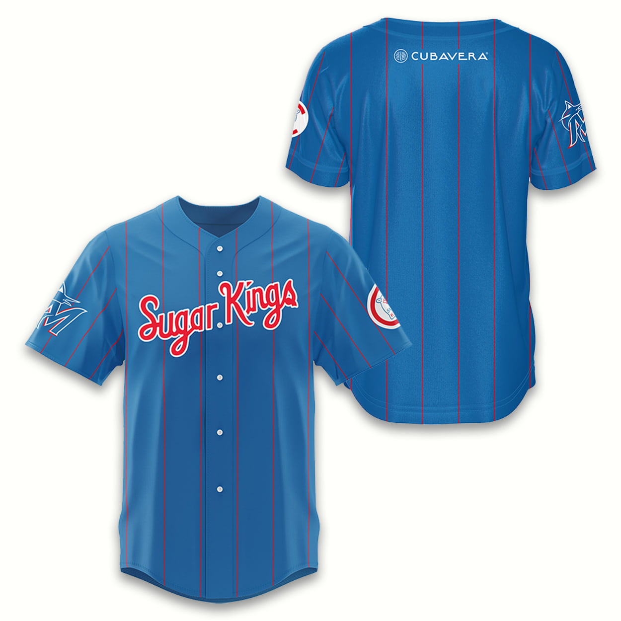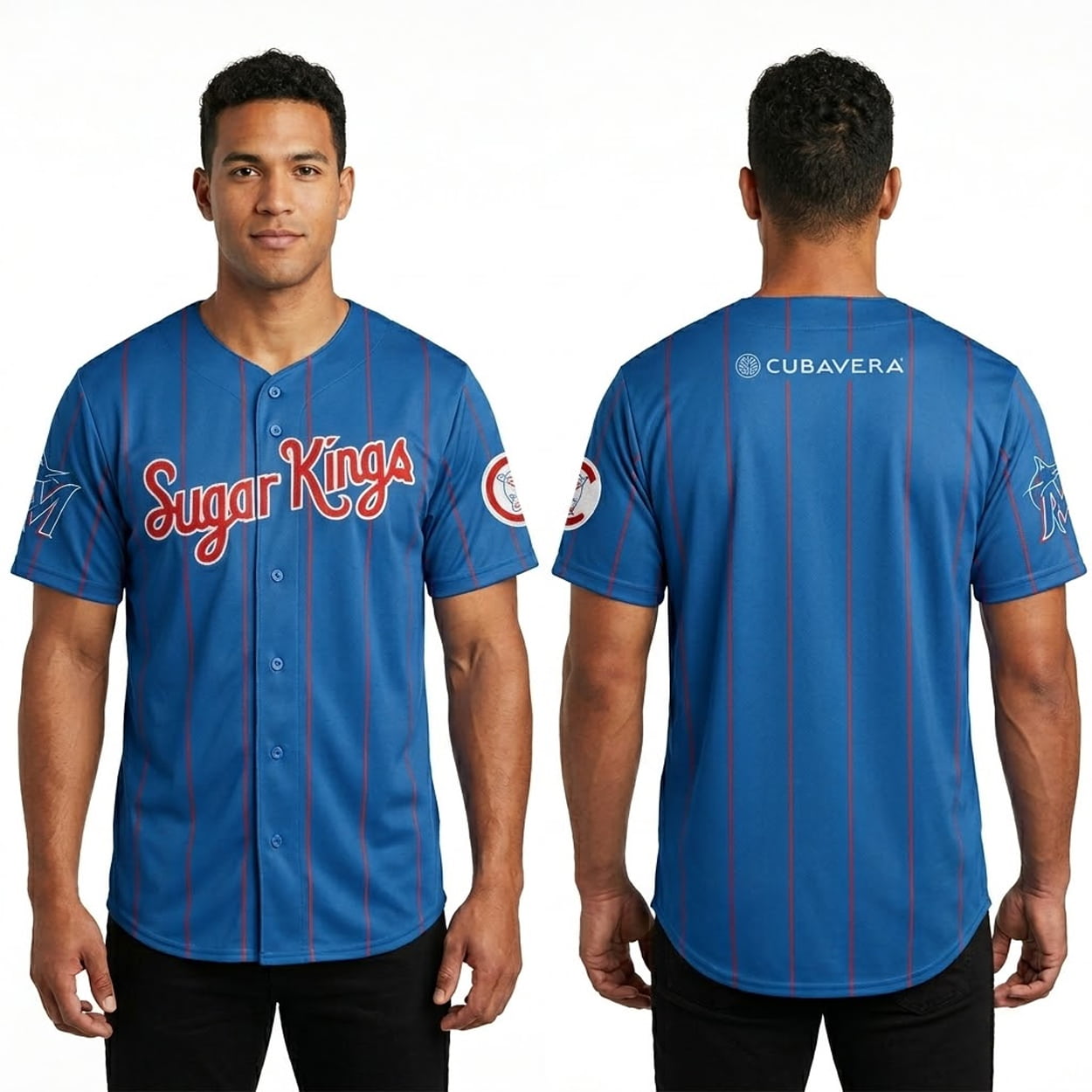 This jersey brings a vintage aesthetic to the modern diamond. The entire garment is detailed with classic vertical pinstripes. The chest prominently displays the historic Sugar Kings script logo. The right sleeve features the modern Miami Marlins logo, while the left sleeve showcases the classic circular Sugar Kings patch. The design is cleanly finished with a subtle CUBAVERA sponsor logo positioned on the upper back below the neckline.
