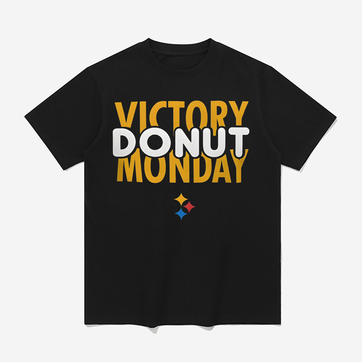This shirt delivers a bold graphic celebrating the best start to a week. The front design prominently features the phrase “VICTORY DONUT MONDAY” in a striking yellow-gold and white palette, with the word “DONUT” utilizing a creatively stylized letter. Beneath the central text, the unmistakable red, yellow, and blue stars of the Steelers logo are included. This durable apparel allows fans to wear a direct expression of their excitement after a team win.