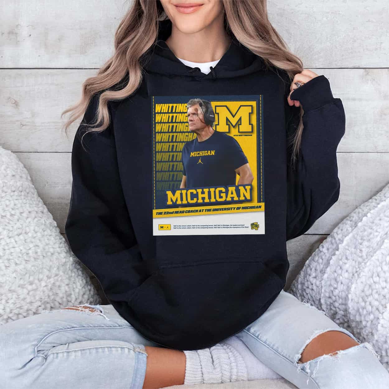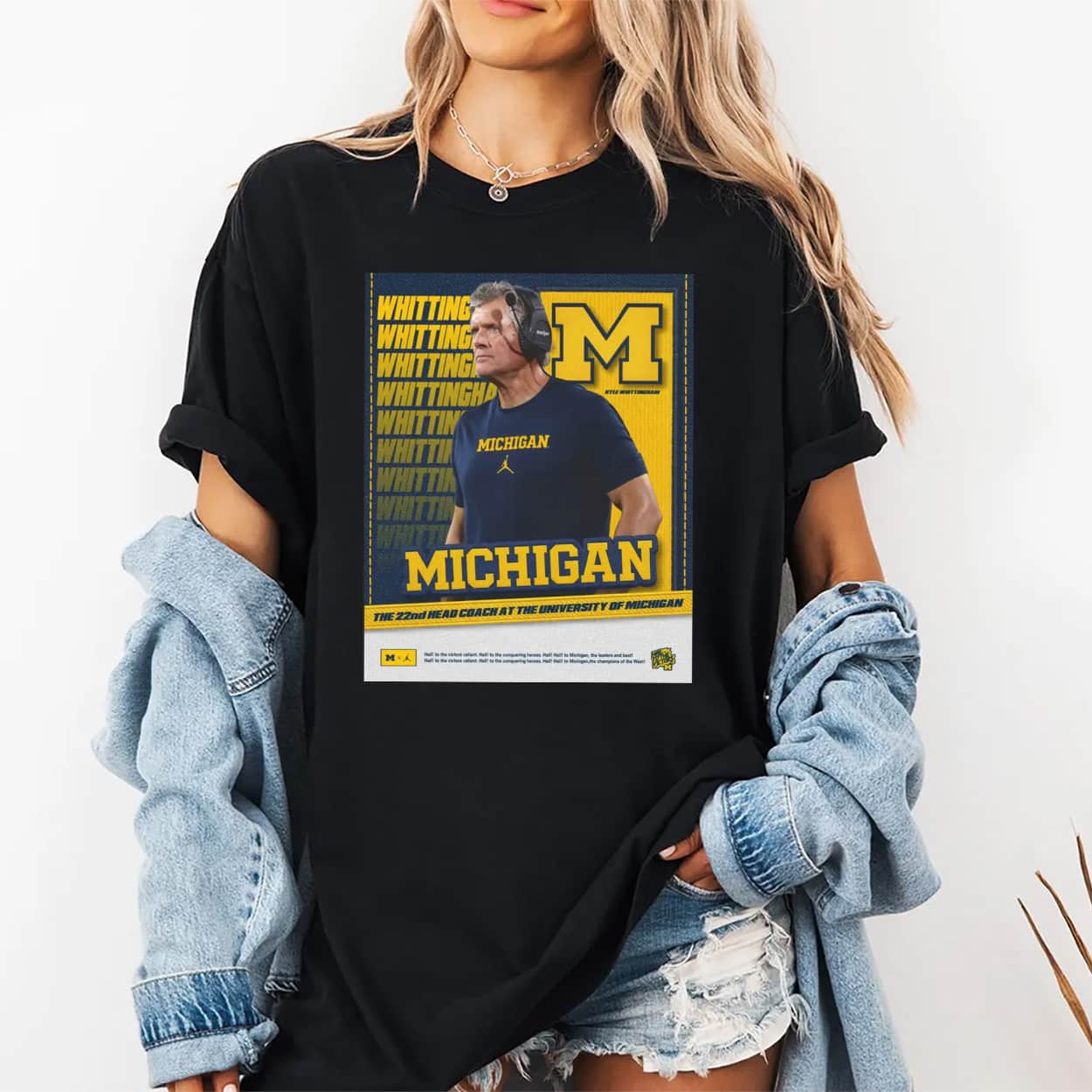 Welcome the new leader of the Wolverines with a design that commands respect. This t-shirt features a high-quality, poster-style graphic of Kyle Whittingham donning official Michigan gear, set against a backdrop of repeating “WHITTINGHAM” text in the team’s signature maize. The design is anchored by a massive block “M” logo and the bold declaration “MICHIGAN,” with a banner explicitly identifying him as “THE 22nd HEAD COACH AT THE UNIVERSITY OF MICHIGAN”. The bottom of the graphic features the iconic lyrics to “The Victors,” cementing his place in the school’s storied tradition.