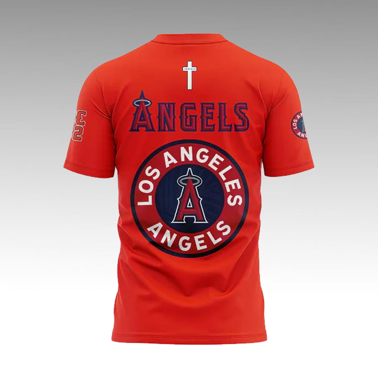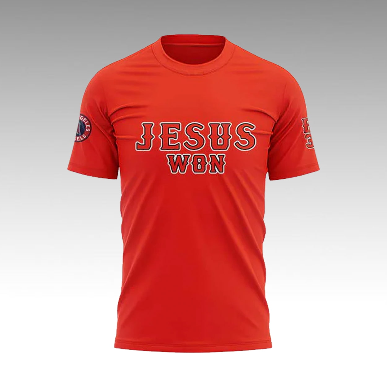 The Mike Trout Jesus Won Shirt features “JESUS WON” printed prominently across the chest using a classic athletic outline font. The back design showcases “ANGELS” typography positioned beneath a cross emblem, anchored by a large, circular team graphic.