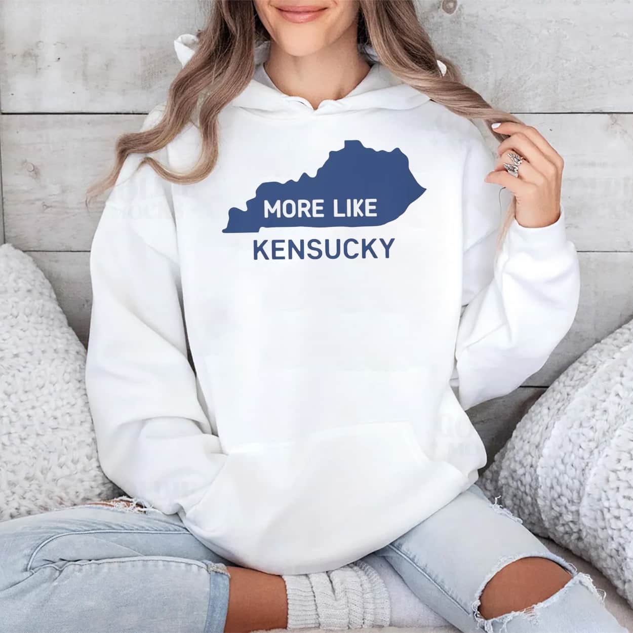 This t-shirt makes a bold and humorous statement for any rival fan. The design features a simple, recognizable silhouette of the state of Kentucky. Inside this blue shape, the shirt delivers its punchline: the text “MORE LIKE” printed above the witty pun “KENSUCKY.” It’s a clean, minimalist design that gets its message across instantly.