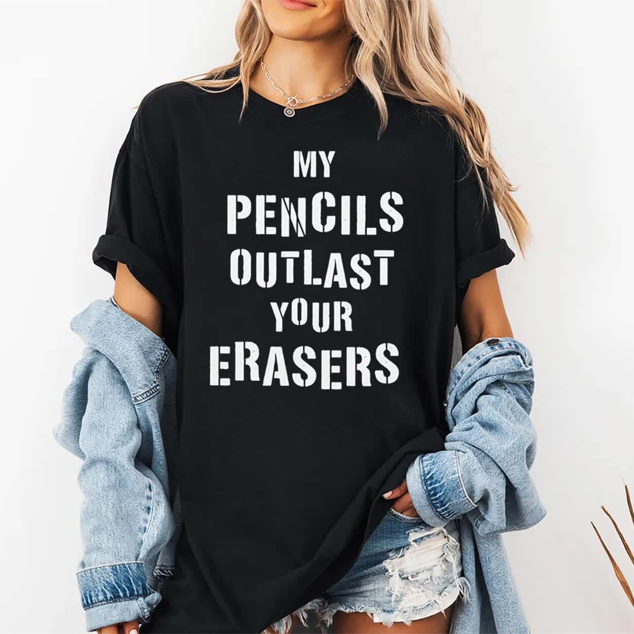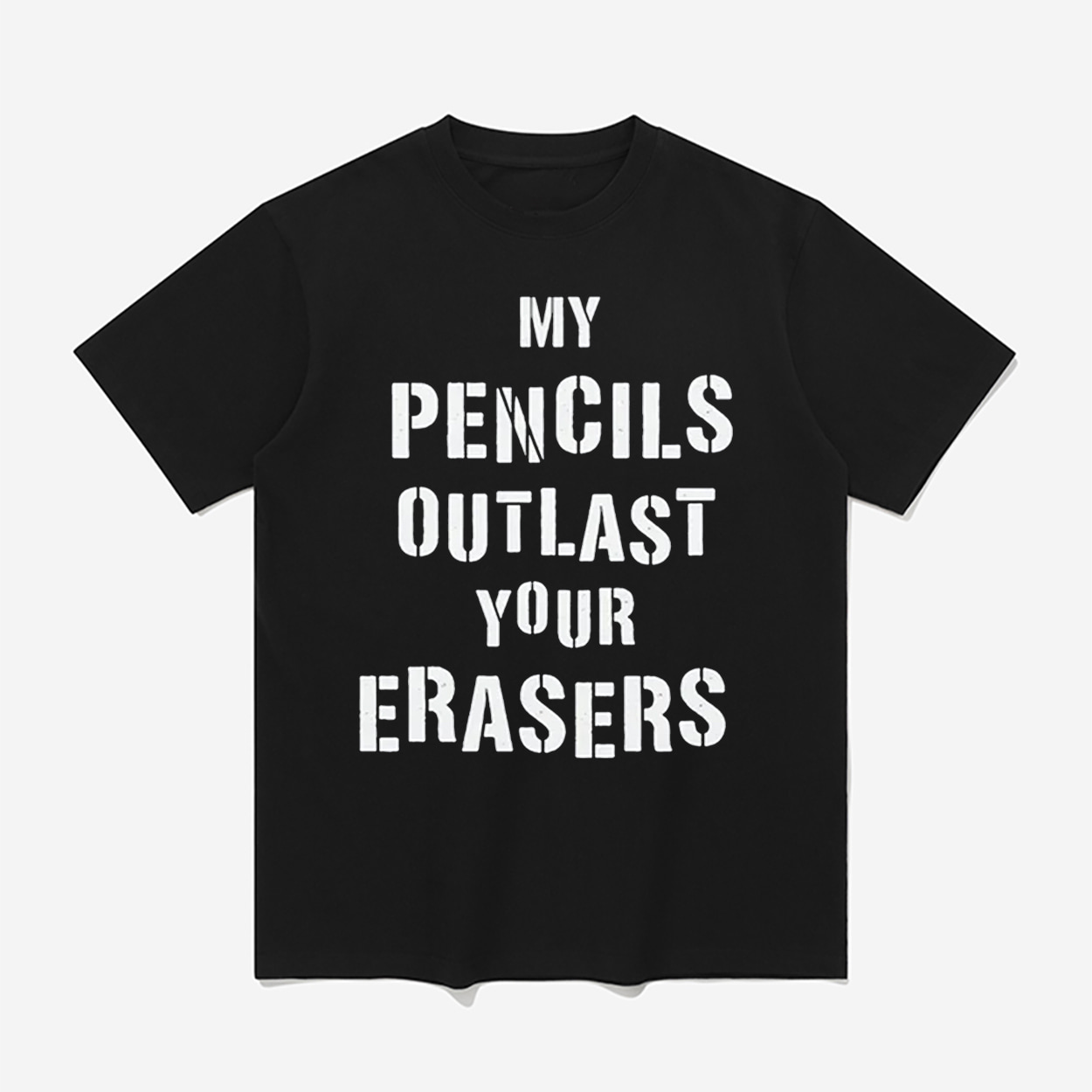 This shirt features a striking, central graphic that contains the text: “MY PENCILS OUTLAST YOUR ERASERS”. The typography is clean and high-contrast, designed to maximize the impact of the statement. The shirt is designed with a standard fit for easy, relaxed wear in any casual setting.