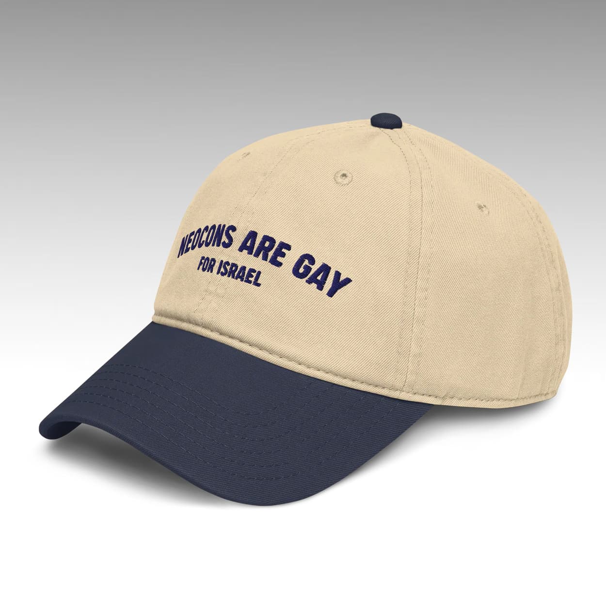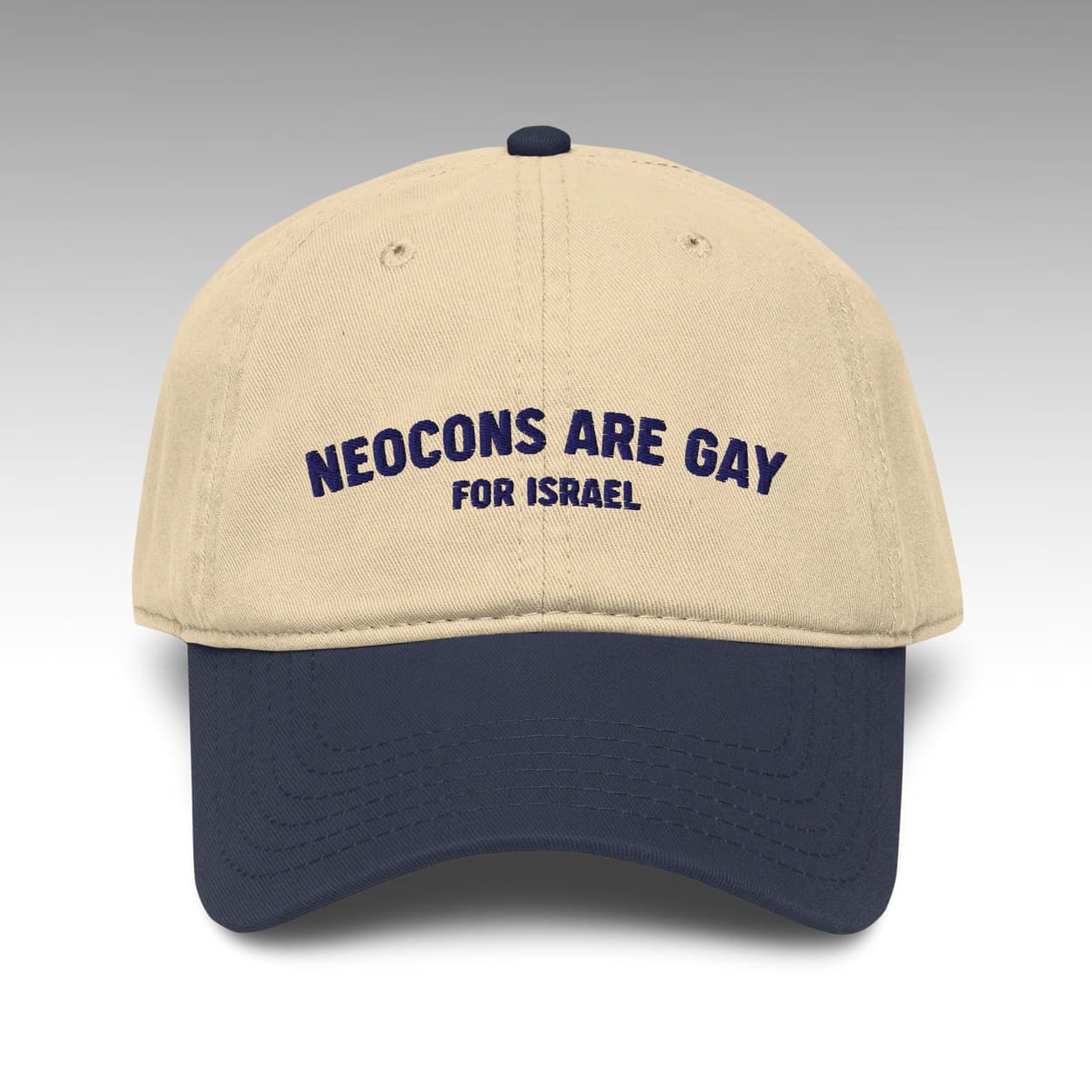 Make a bold political statement with the Neocons Are Gay For Israel Hat. This straightforward cap relies entirely on its provocative, text-based design. The front crown features the phrase “NEOCONS ARE GAY FOR ISRAEL” in bold, legible typography, creating a striking visual that commands immediate attention and delivers its message without the need for complex graphics or imagery.