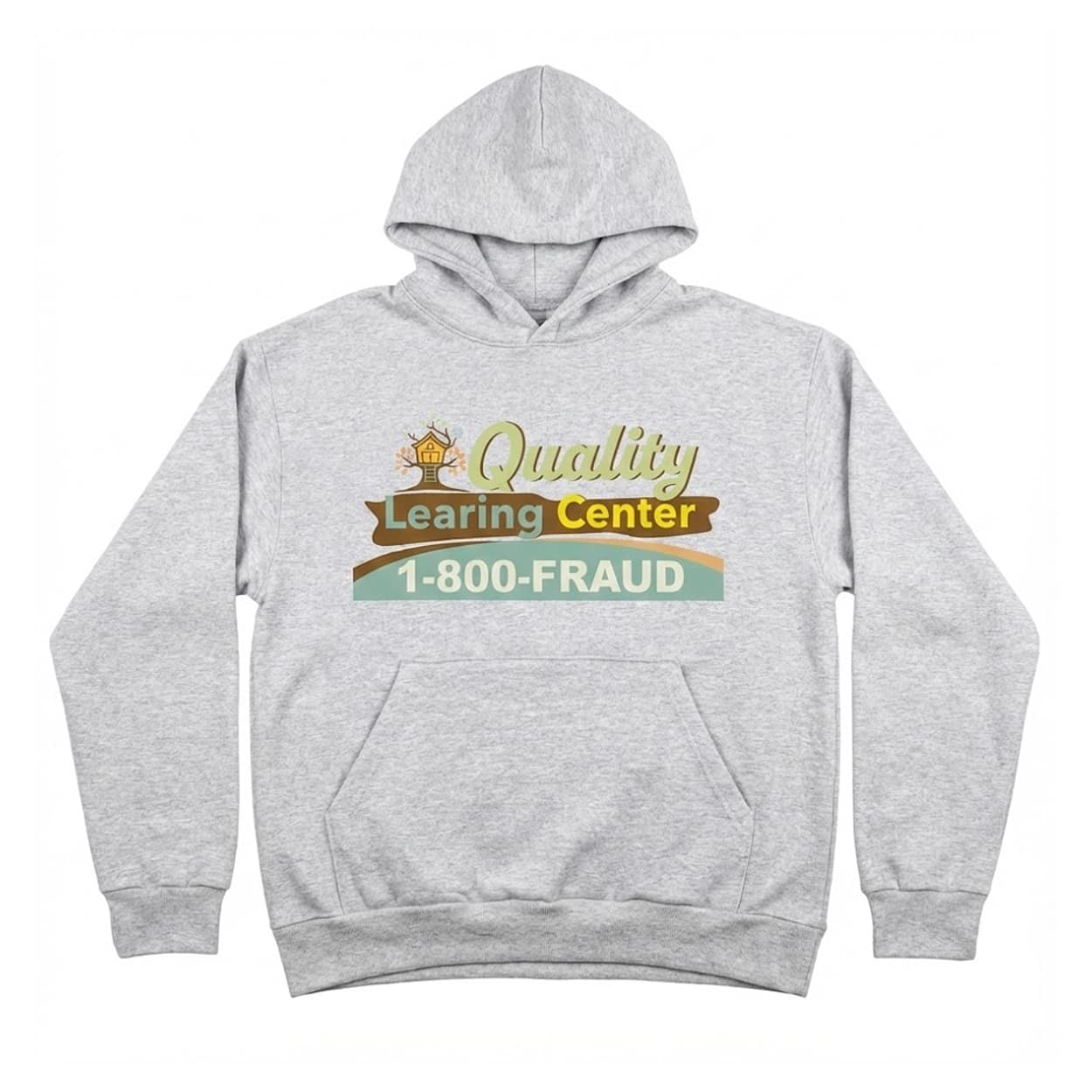 Show your meme savvy with the Nick Shirley Quality Learing Center Hoodie, a lighthearted jab at day care drama. The front design mimics the center’s sign with a tree-house icon, “Quality Learing Center” in colorful script, and “1-800-FRAUD” hotline in teal for satirical punch.