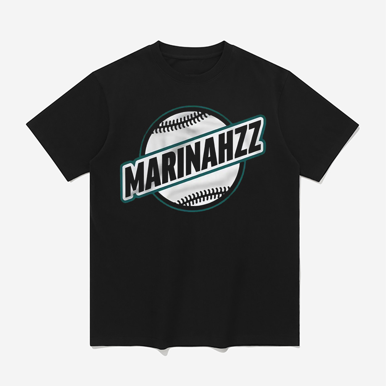This shirt prominently displays the iconic “MARINAHZZ” logo, set diagonally across a classic baseball graphic. The lettering utilizes the Seattle team’s signature teal and white color palette, resulting in a clean, bold aesthetic that instantly stands out. Crafted for comfort and longevity, this apparel allows fans to wear a piece of modern baseball history with quality and style.