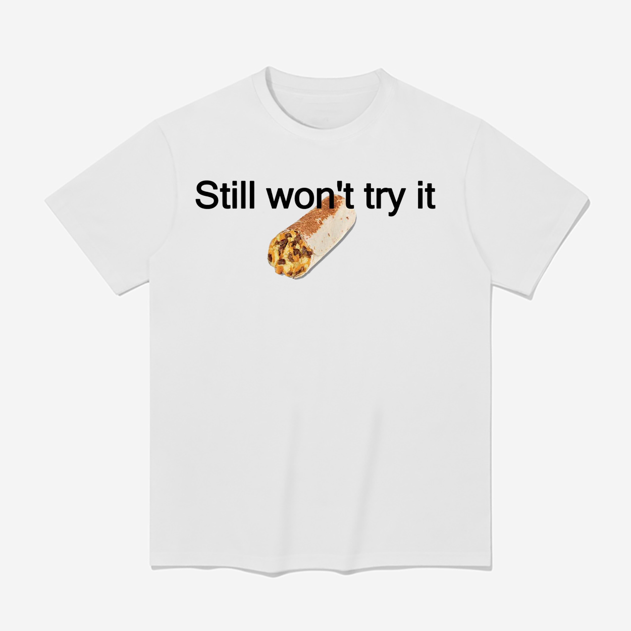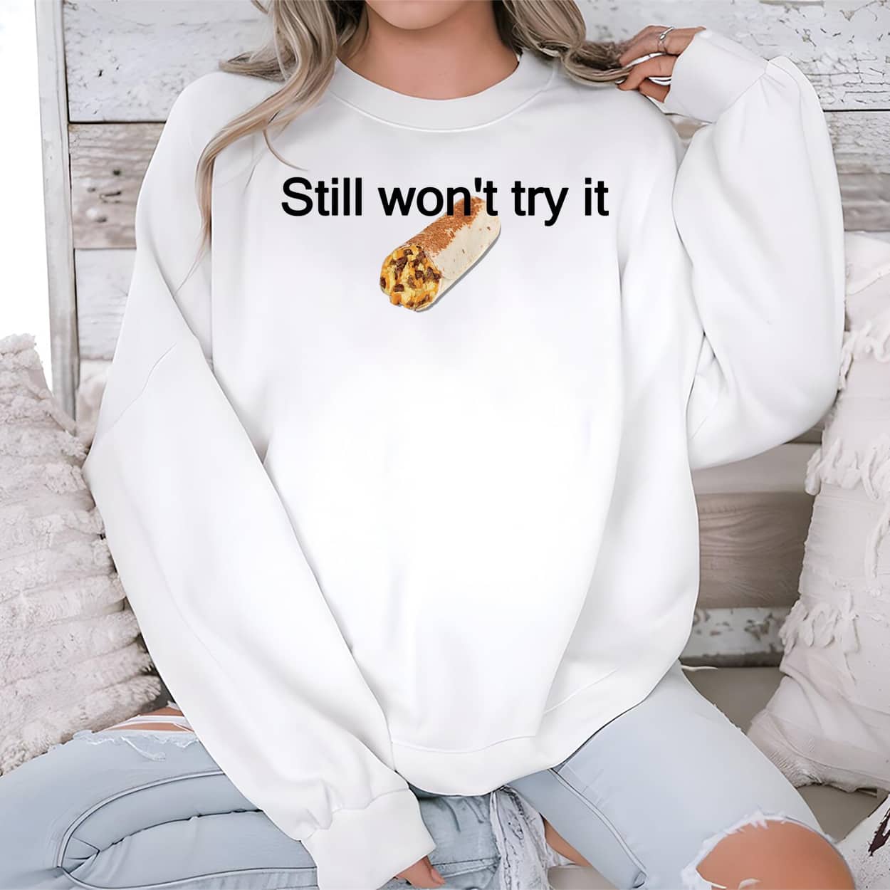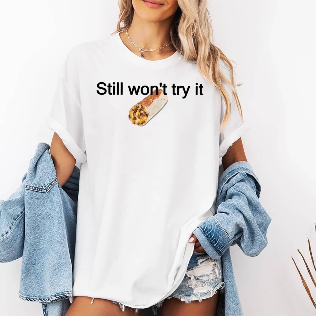 Embrace Nikola Jokic’s playful side with the Still Won’t Try It Taco Shirt, a humorous take on the star’s food aversions. The design centers “Still won’t try it” in stark black lettering above a quirky taco graphic styled like a cigarette for added whimsy.