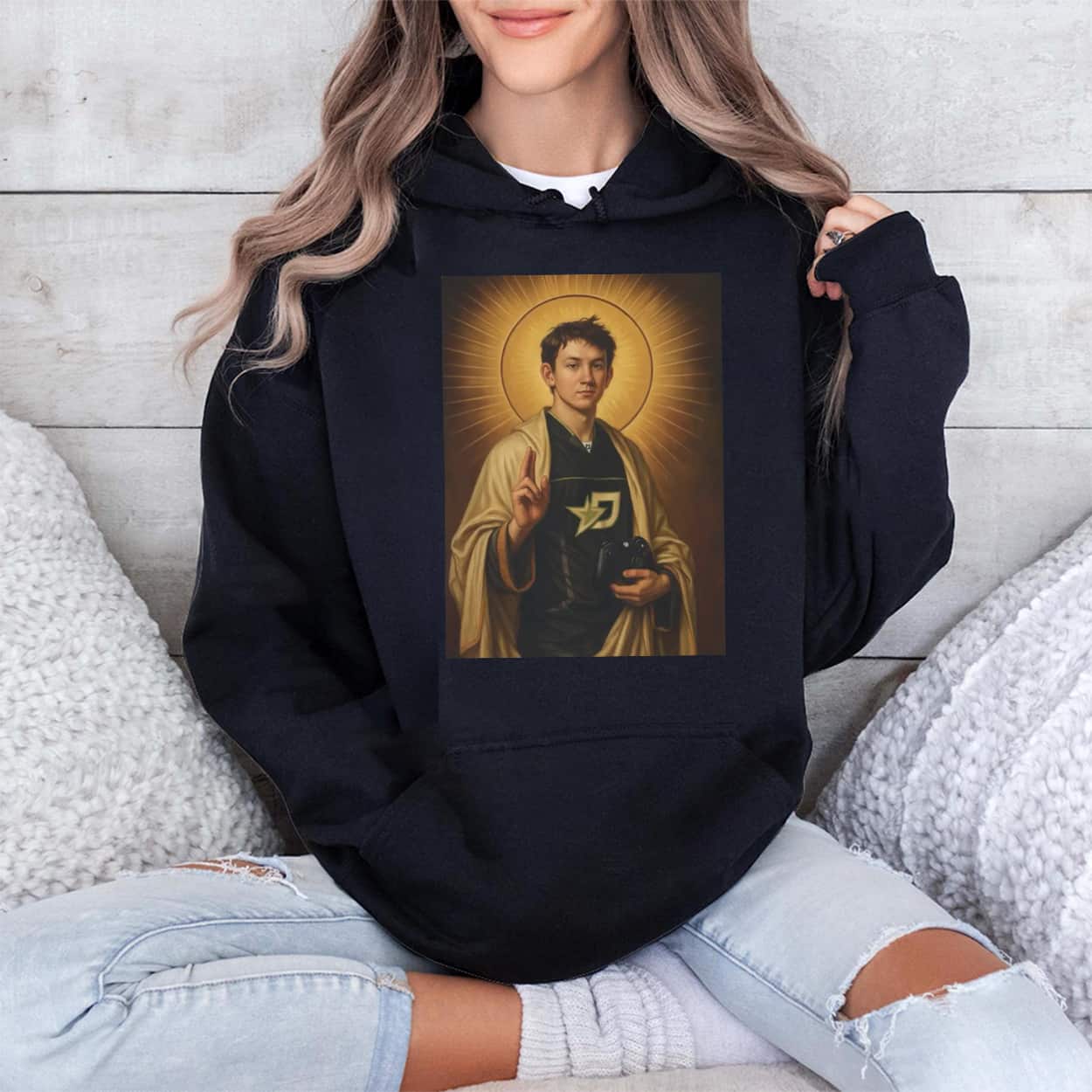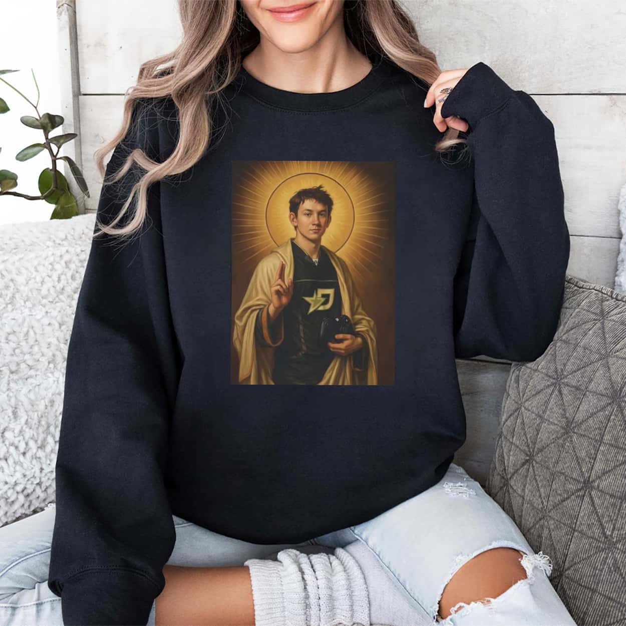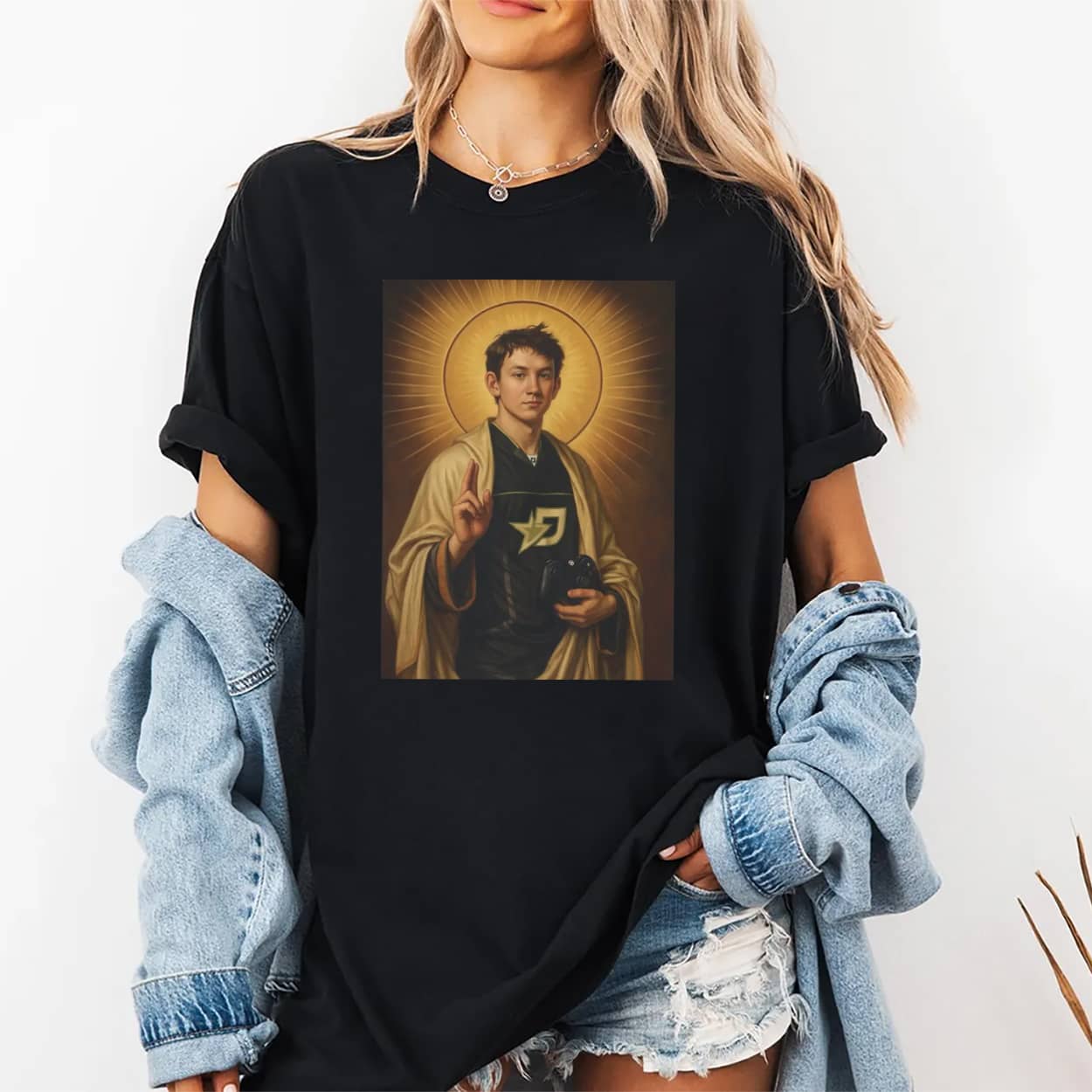The OpTic Saint Mercules Shirt features a detailed, renaissance-style portrait of professional gamer Mason “Mercules” Ramsey on the chest. The design depicts him as a traditional religious saint, complete with a radiant halo, draped robes, and a modern game controller resting in his hands. He is wearing the recognizable OpTic star logo jersey, blending classical art with modern gaming culture on a classic short-sleeve crewneck.