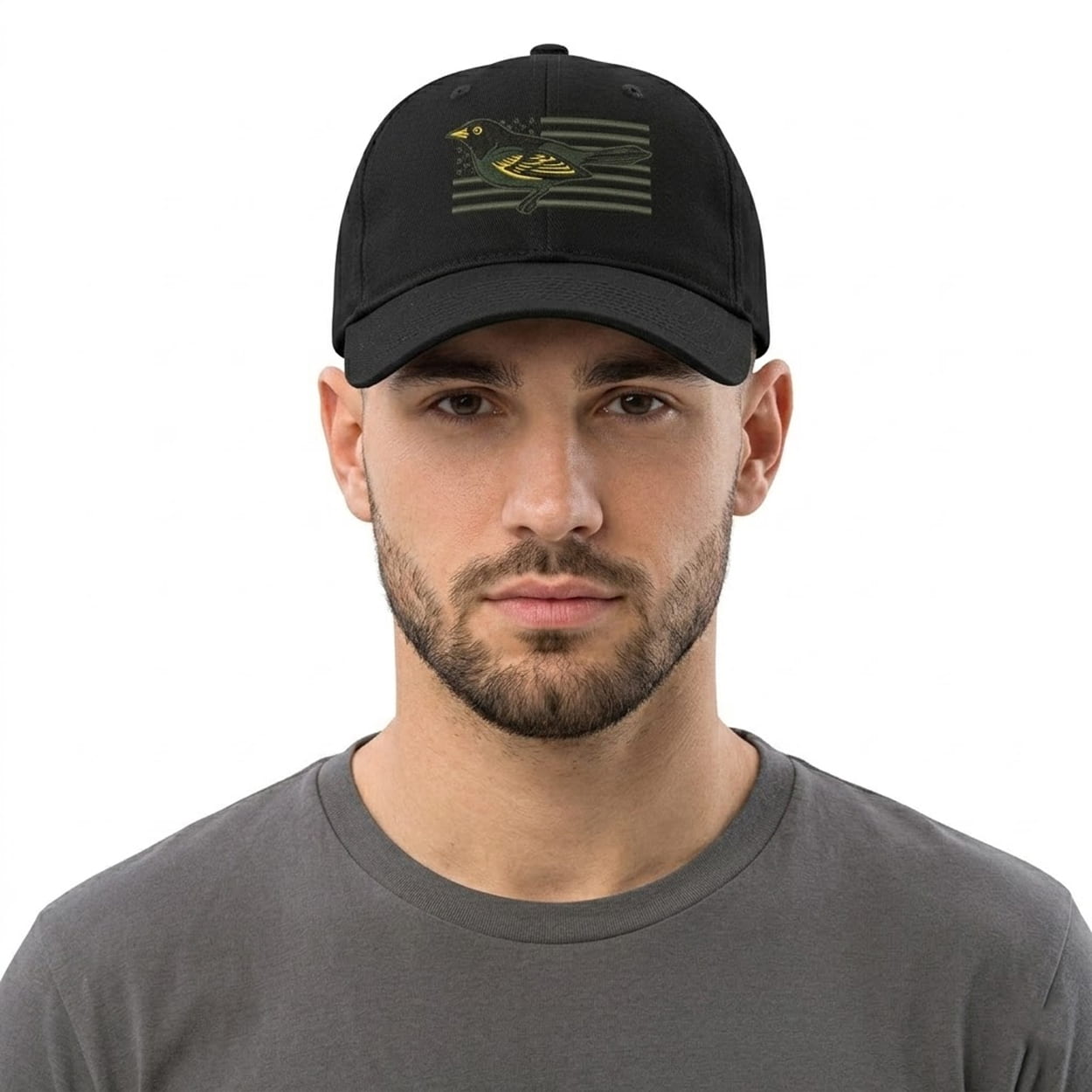 This structured cap features a stealthy, tactical-inspired design. The front showcases a detailed embroidery of the classic bird mascot boldly positioned over a subtle, muted American flag graphic to deliver a sharp, patriotic aesthetic.