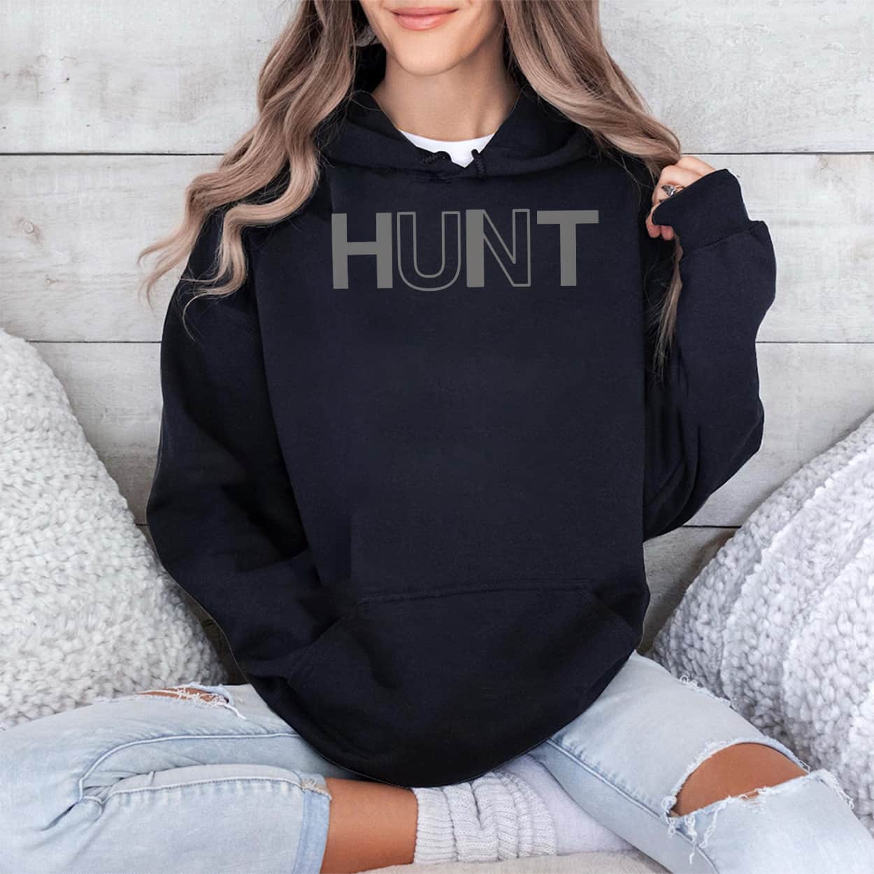 Embrace the focused intensity of playoff baseball with this shirt, featuring the bold word “HUNT” emblazoned across the chest. The text is rendered in a modern, light gray font with a cool, subtle outline effect, making it pop against the dark fabric. It’s the perfect way to show you’re ready to relentlessly pursue success, whether you’re at the ballpark or just out and about.