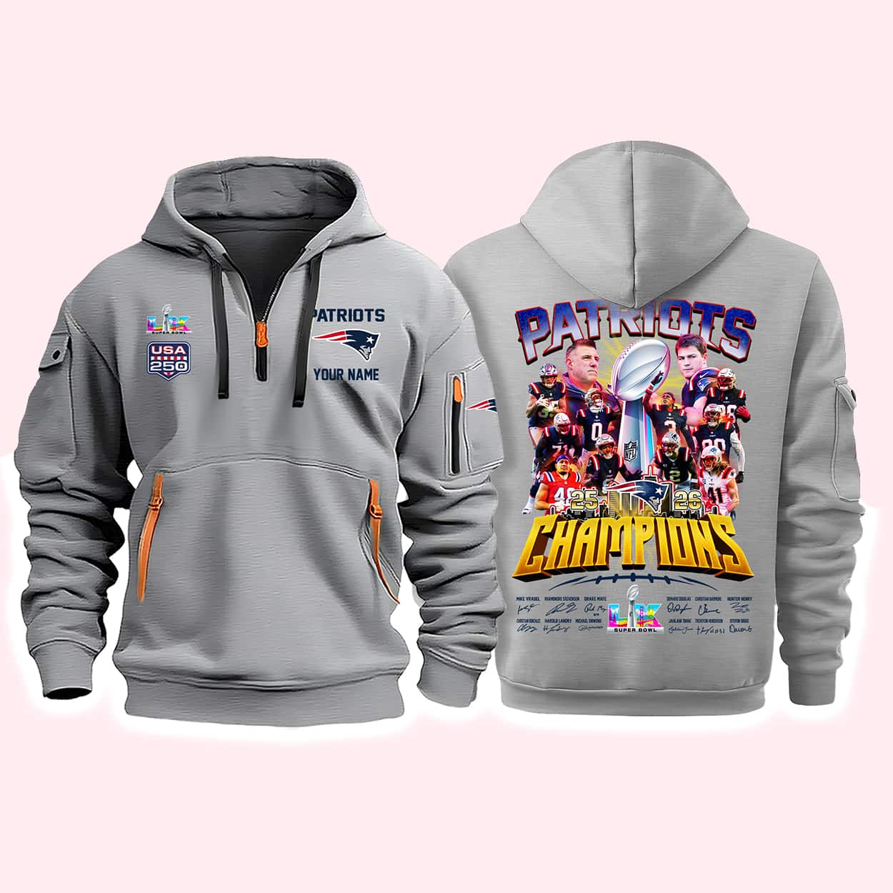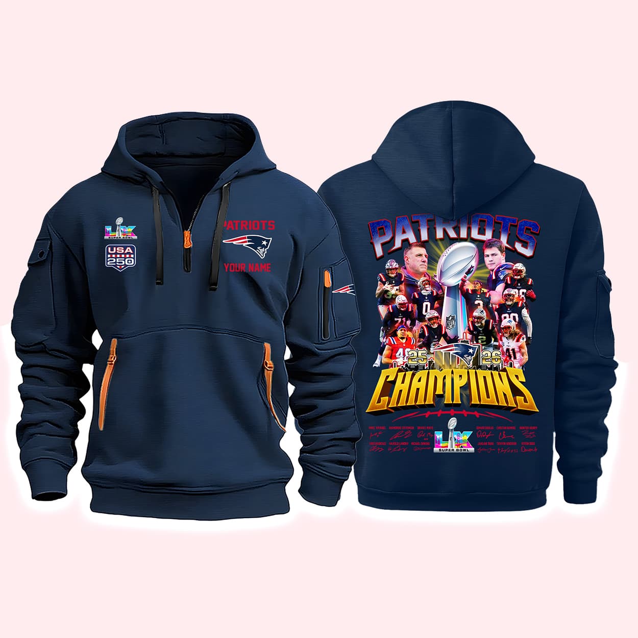 Celebrate a historic double-milestone with the Patriots Super Bowl LX Champions USA 250 Quarter Zip Hoodie. This pullover honors New England’s 2026 championship and the United States’ 250th anniversary. Featuring high-density embroidery, patriotic USA 250 sleeve graphics, and official Super Bowl LX insignias, it’s the ultimate collector’s piece for the Dynasty. Stay warm while showing your pride for the team and the nation. Limited stock available—secure your commemorative quarter-zip hoodie today!