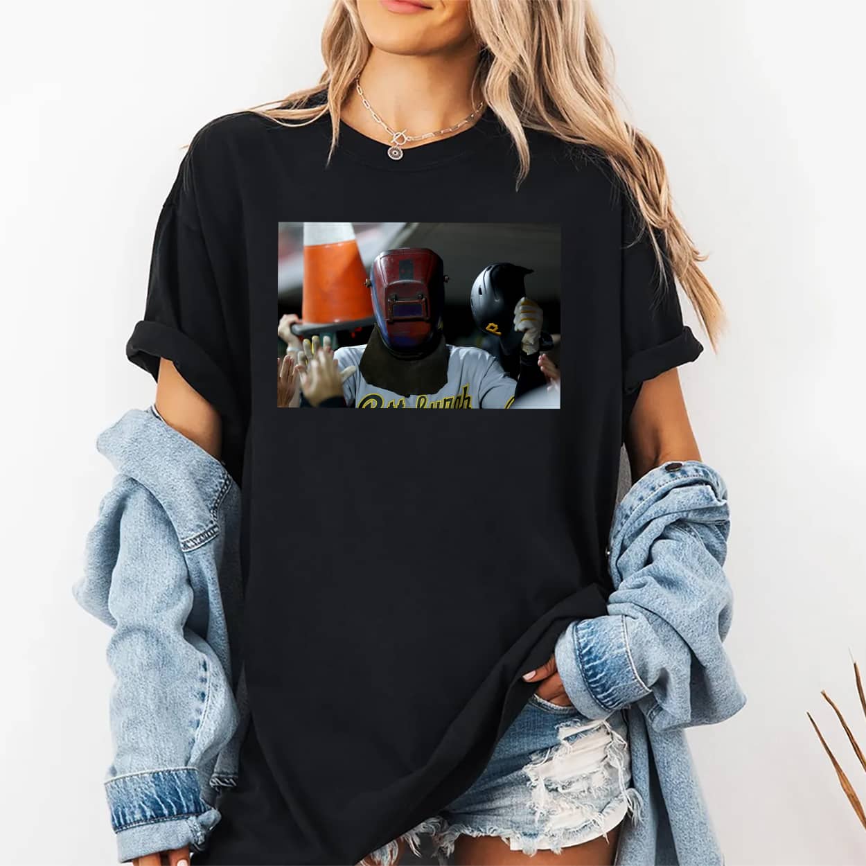 The Pirates Welding Hood Hoist The Cone Shirt highlights a prominent, centered photographic graphic capturing a wildly popular dugout moment. The image showcases a player fully geared in the team’s signature home run welding mask, enthusiastically celebrating with teammates. Elevated in the immediate background is the now-legendary rally traffic cone. This precise layout ensures the authentic stadium photography and the associated inside jokes act as the primary focal points of the garment, avoiding any unnecessary design distractions.
