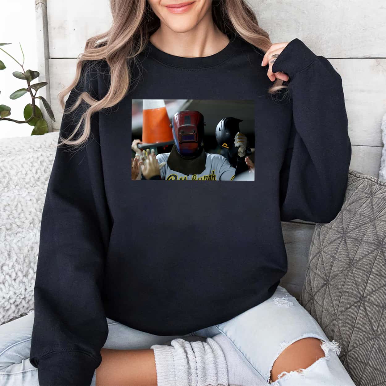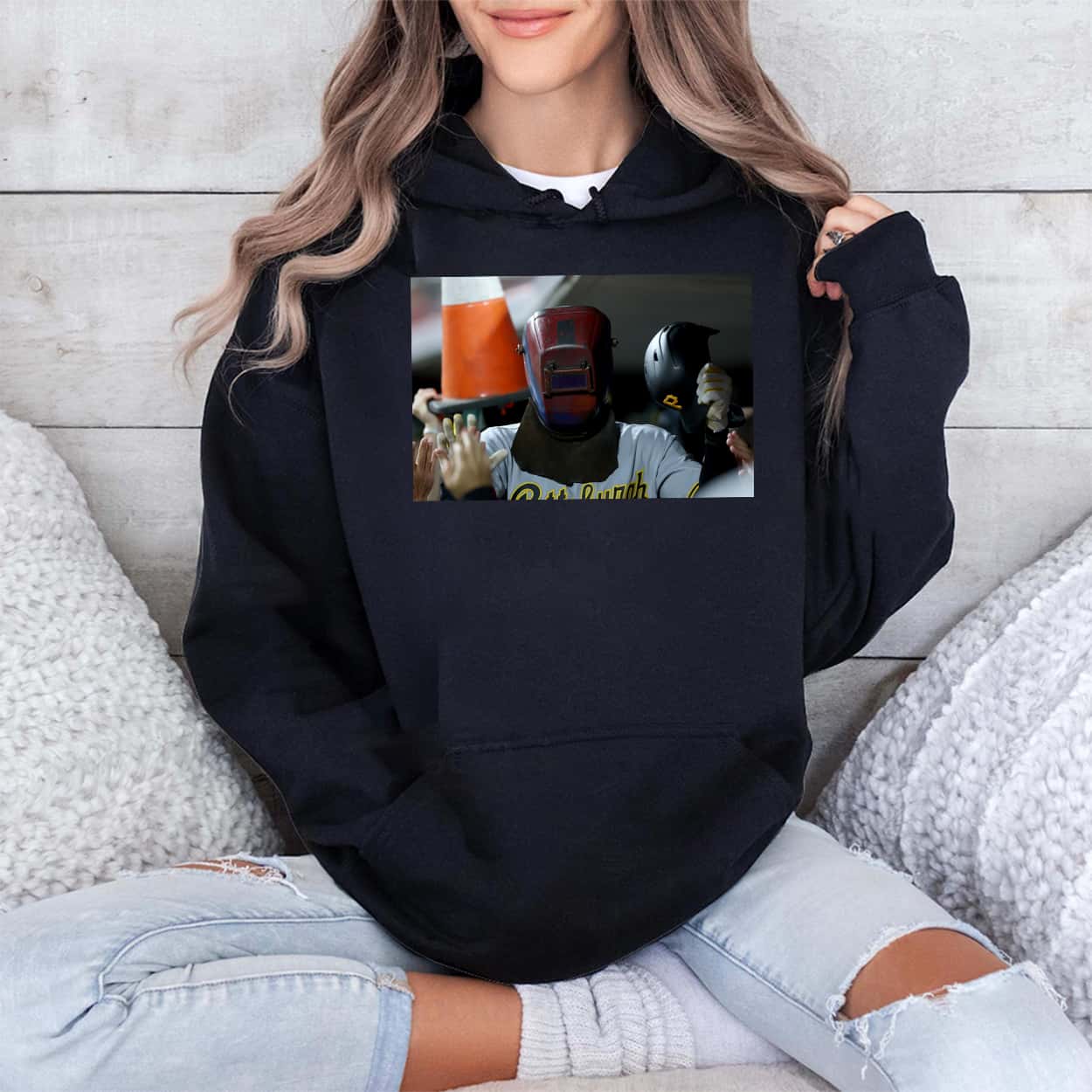 Originating from a viral surge of offensive energy, this apparel directly references the team’s dual celebration props. The welding mask represents the hard-working, industrial identity of Pittsburgh, while the traffic cone was organically adopted to symbolize “directing traffic” and bringing base runners safely home. This graphic tee is intended for dedicated Pittsburgh baseball fans, followers of pop-culture sports moments, and sports memorabilia collectors who appreciate highly recognizable franchise lore and team camaraderie.