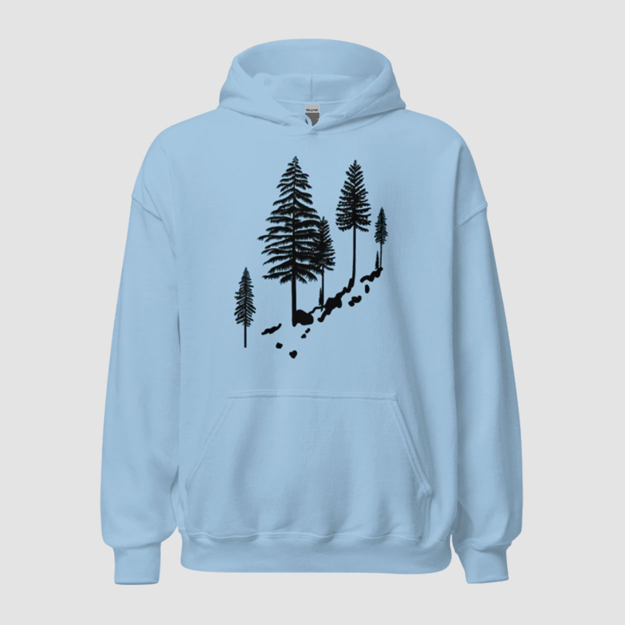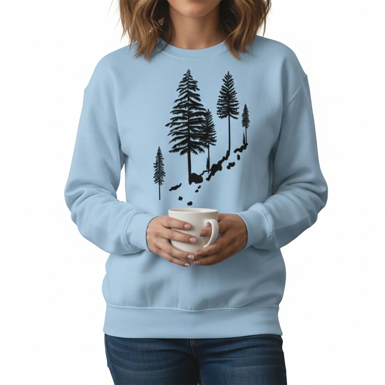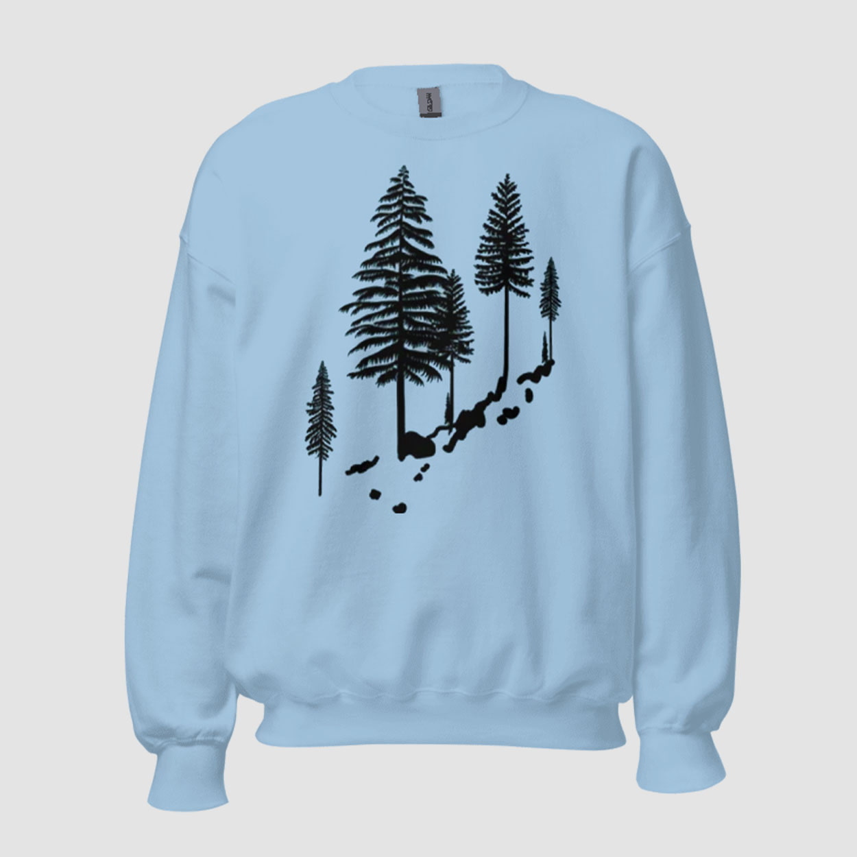 Dive into serene style with the Pluribus Carol Pine Tree Sweatshirt. The design showcases a diagonal arrangement of five black-outlined pine trees of varying heights climbing a rocky slope, evoking a minimalist mountain landscape without text or logos for subtle, artistic appeal.