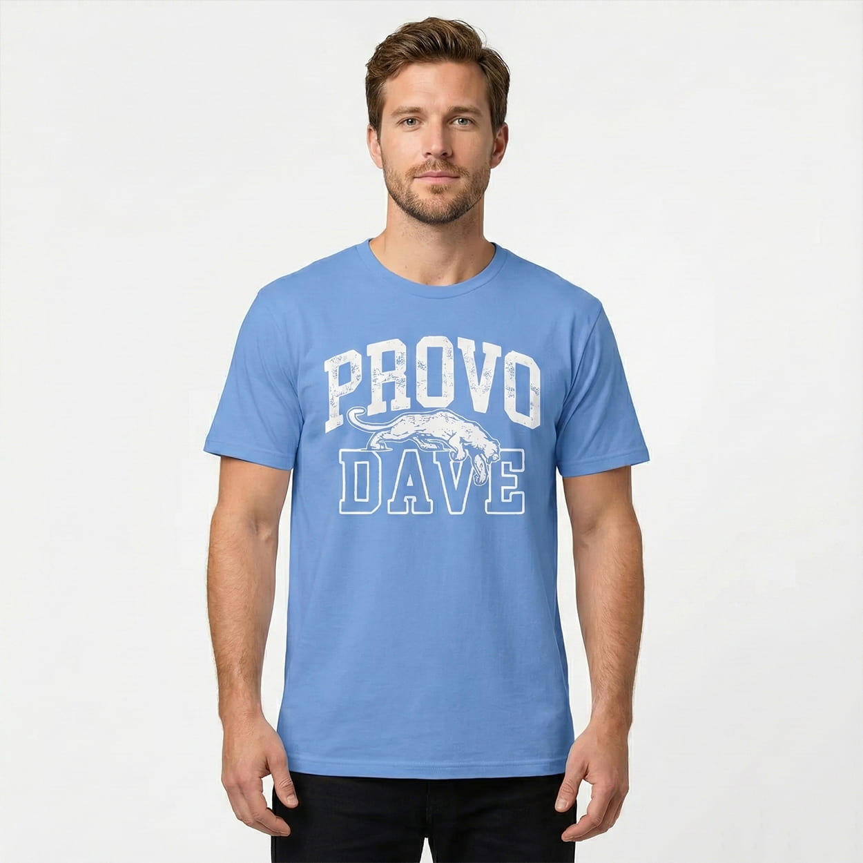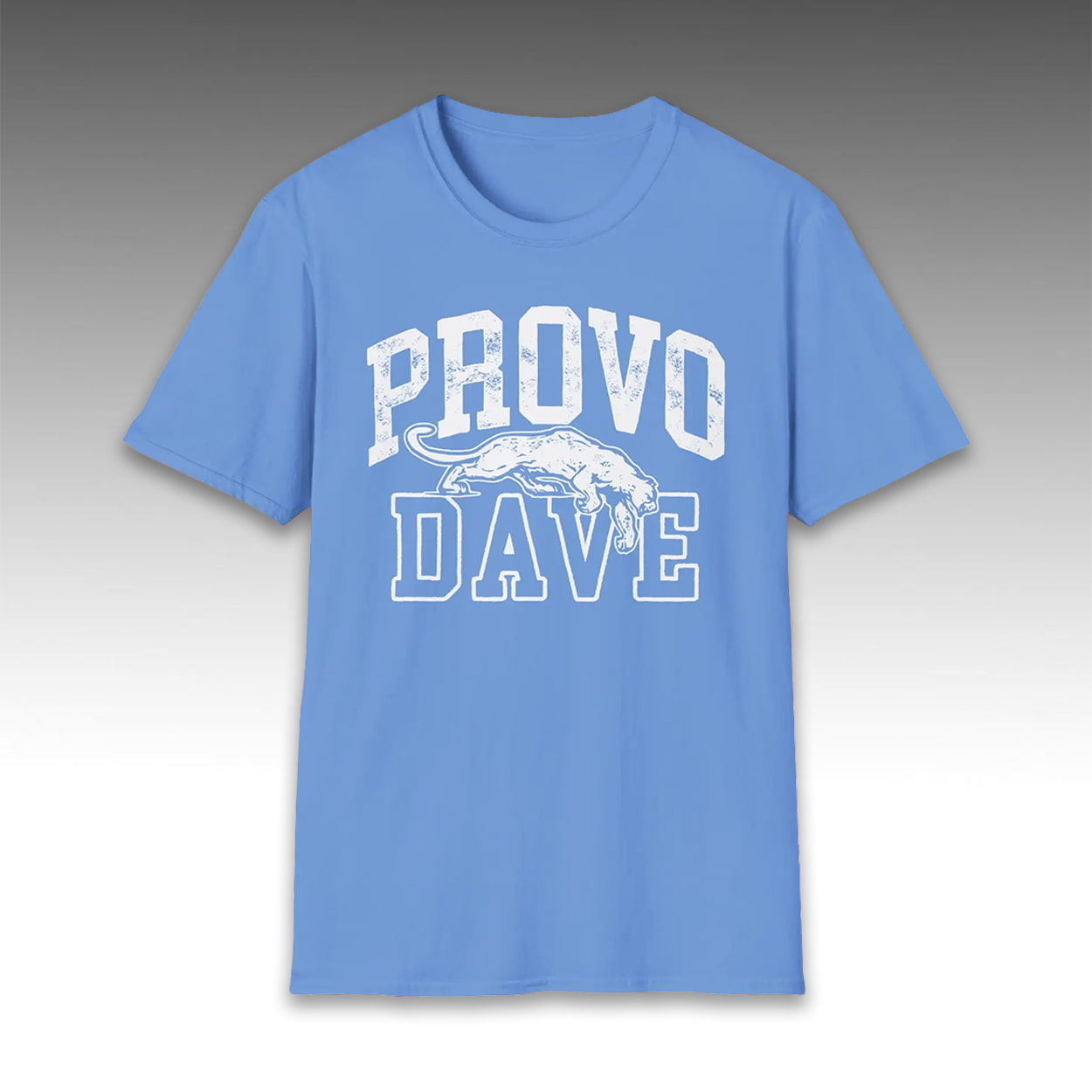 Unleash Cougar spirit with the Provo Dave BYU Shirt. The design boasts “PROVO DAVE” in distressed, arched white lettering with a stylized cougar integrated into the “D” for mascot flair, centered on a soft light blue cotton base evoking BYU’s colors.
