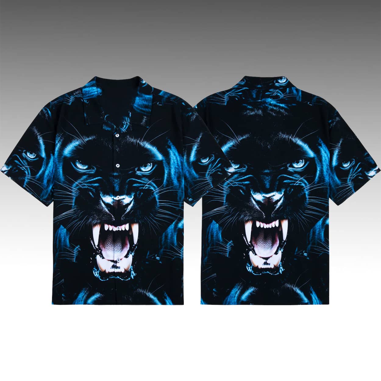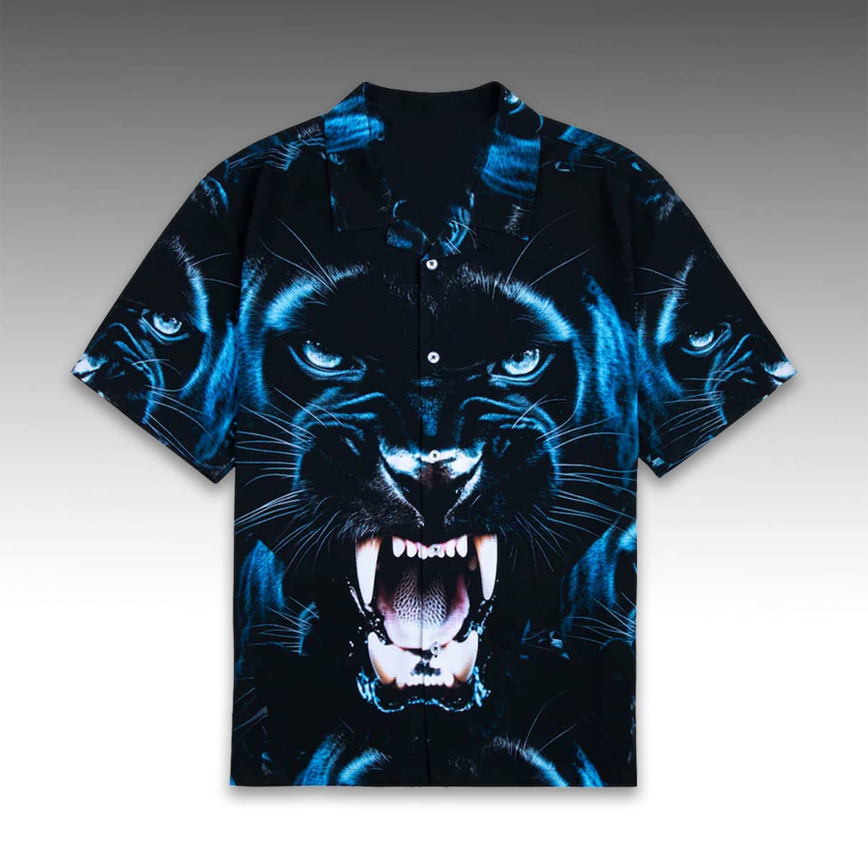 Unleash your wild side with a shirt that commands attention in any arena. This hawaiian shirt features an intense, high-definition all-over print of roaring black panthers. The design is dominated by deep blacks and vibrant electric blues, highlighting the ferocious details of the panthers’ bared fangs and piercing eyes. The relaxed fit and lightweight fabric make it a versatile piece that blends tropical comfort with an edgy, predatory aesthetic.