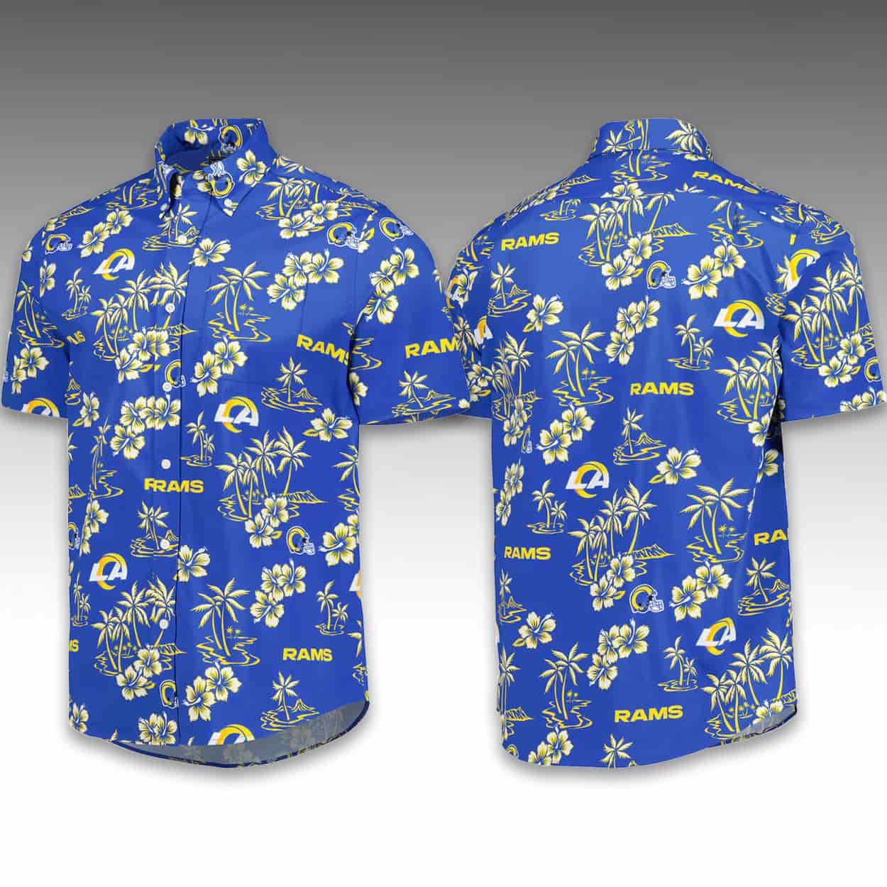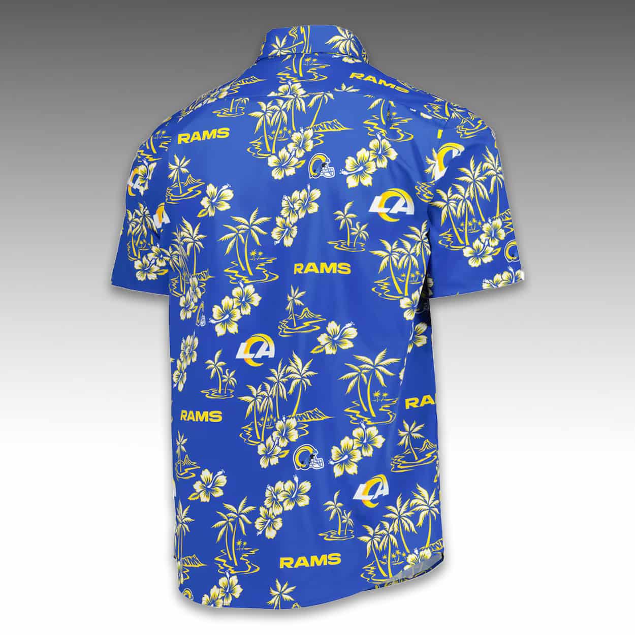 Upgrade your game day fit with the shirt that became an instant sideline classic. This button-down features a vibrant “Royal Blue” base covered in a festive tropical pattern of yellow hibiscus flowers and swaying palm trees. The design is heavily branded for the true fan, with the “LA” logo, the classic Ram head emblem, and the word “RAMS” seamlessly integrated into the island print. It includes a crisp collar and a relaxed fit, perfect for those sunny California game days.