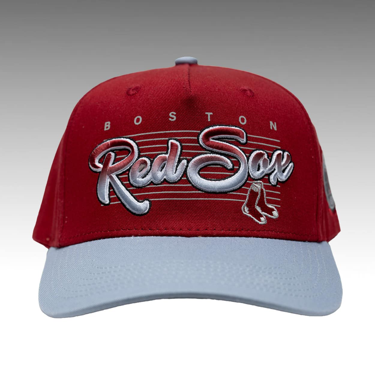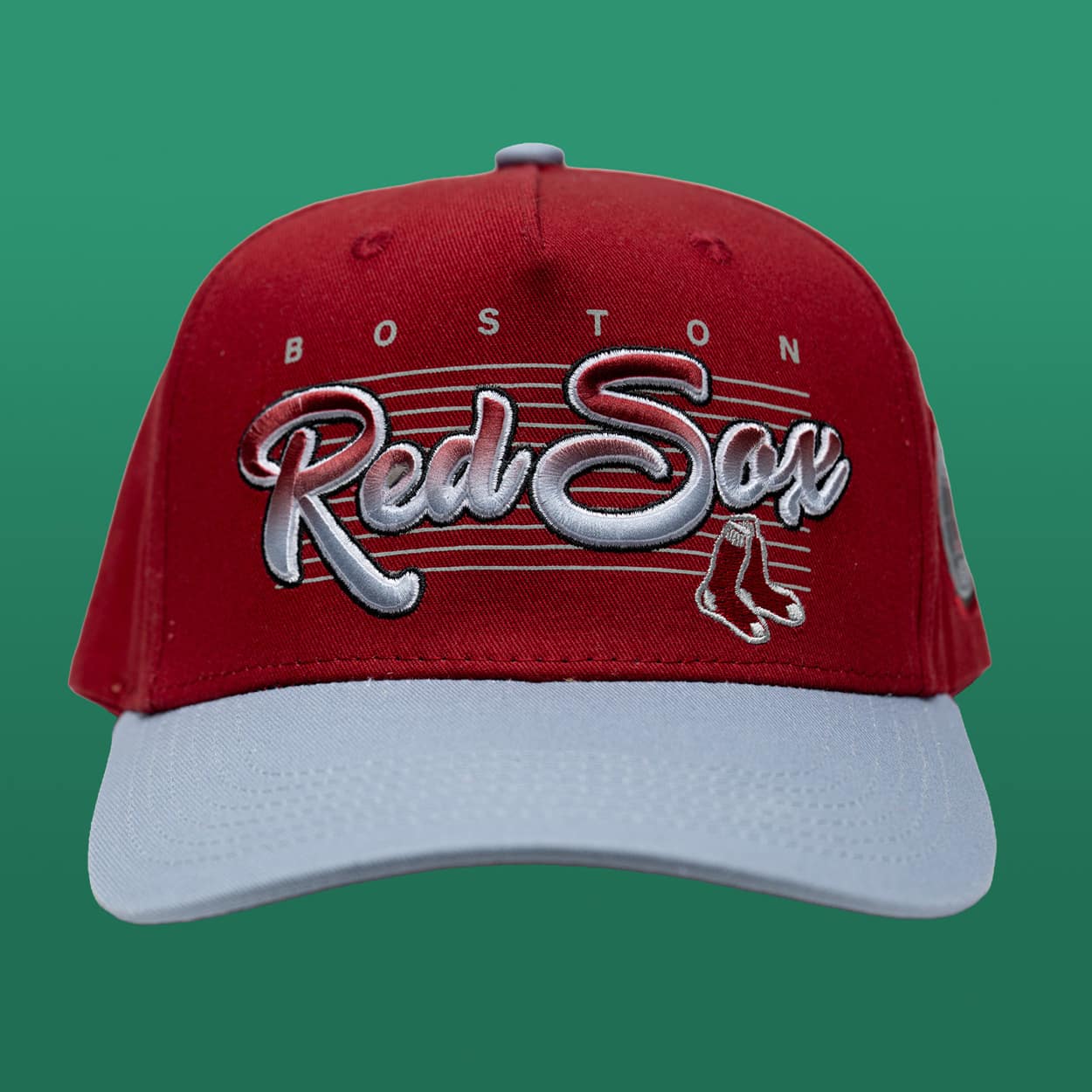 This structured cap features a classic two-tone design. The front panels showcase the iconic team script layered over horizontal pinstripes, accompanied by the legendary hanging socks logo and “BOSTON” arched across the top for a premium collegiate aesthetic.