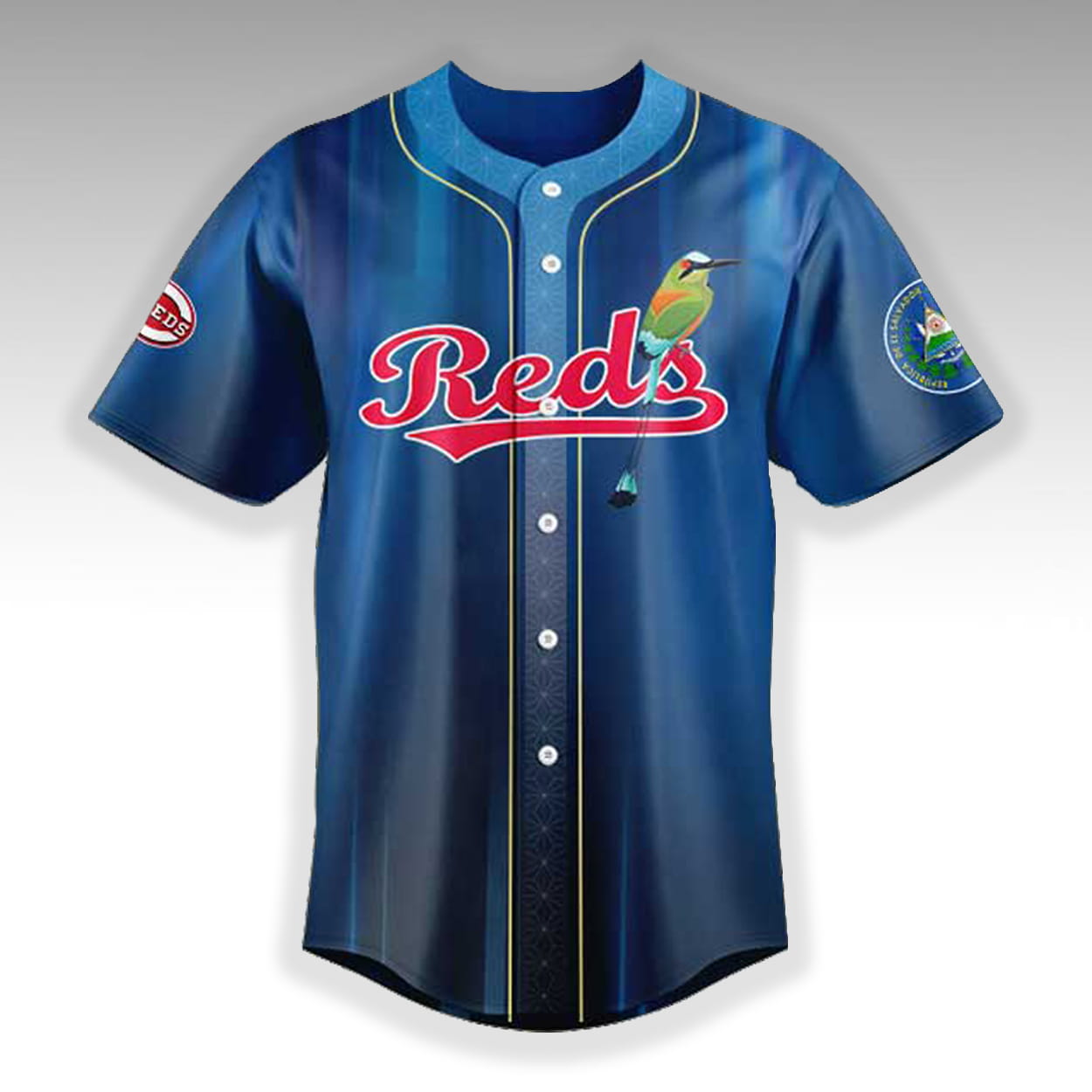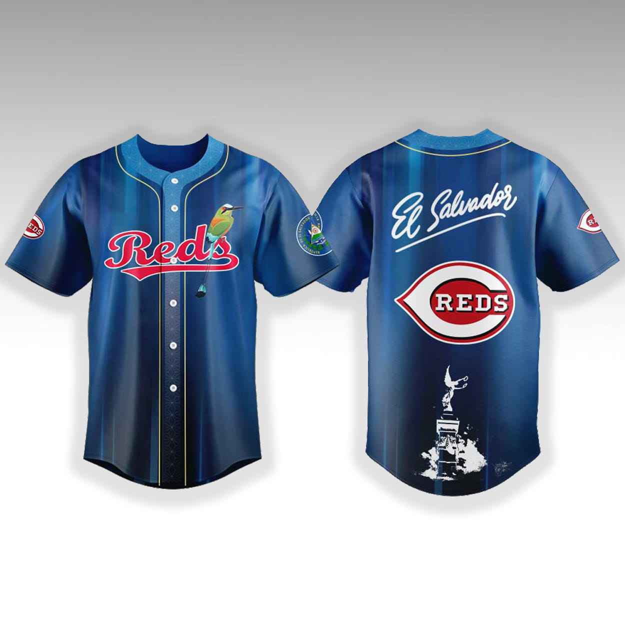 Make a bold statement with a design that honors your roots. The 2026 Reds Salvadoran Heritage Day Jersey features a classic button-down front displaying the signature team script, beautifully accented by an illustration of the Torogoz national bird. The sleeves include custom cultural emblem patches, while the back showcases an elegant “El Salvador” script above the iconic wishbone team logo, anchored by a striking silhouette of the Monumento al Divino Salvador del Mundo on the lower hem.
