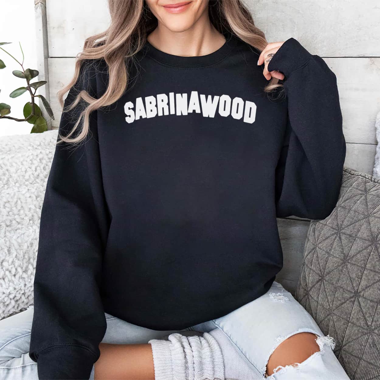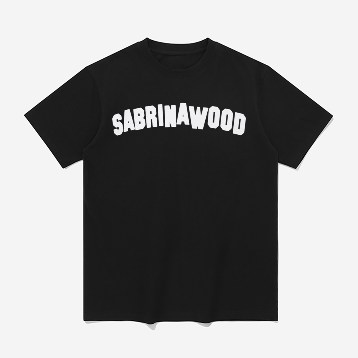 This t-shirt features a striking, minimalist design centered around bold, arched typography. The front proudly displays the word “SABRINAWOOD” in a thick, block-letter font that perfectly mimics the world-famous Hollywood landmark.