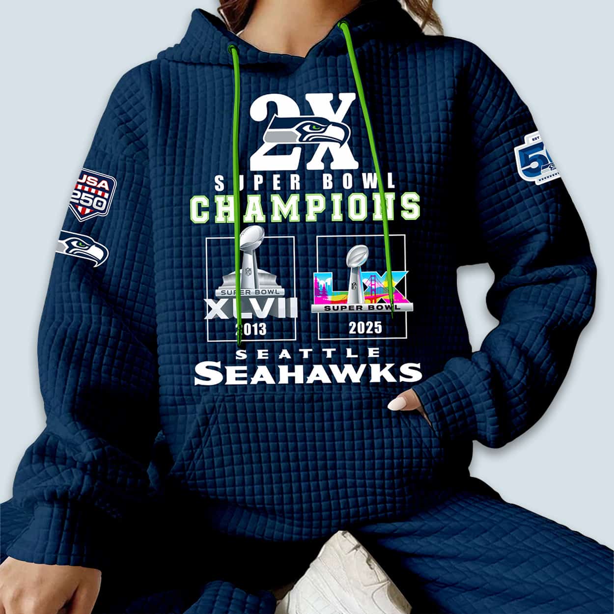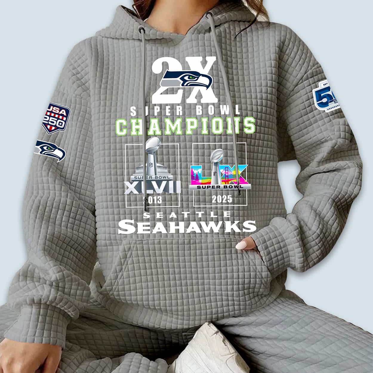 Celebrate a legacy of dominance with the Seahawks 2x Super Bowl Champions Waffle Hoodie. This pullover honors the franchise’s historic victories in Super Bowl XLVIII and Super Bowl LX with a bold “2X” trophy graphic. Featuring exclusive “USA 250” and 50th Anniversary sleeve patches, it’s the ultimate tribute to the 12th Man. Available in Navy, White, Black, and Grey. Own the history. Order your limited-edition dynasty gear today!