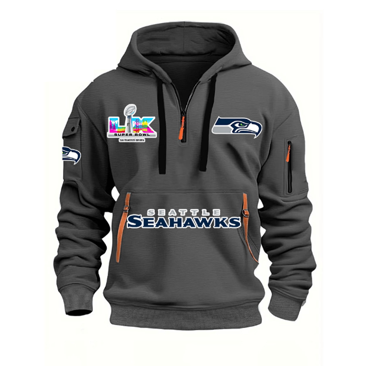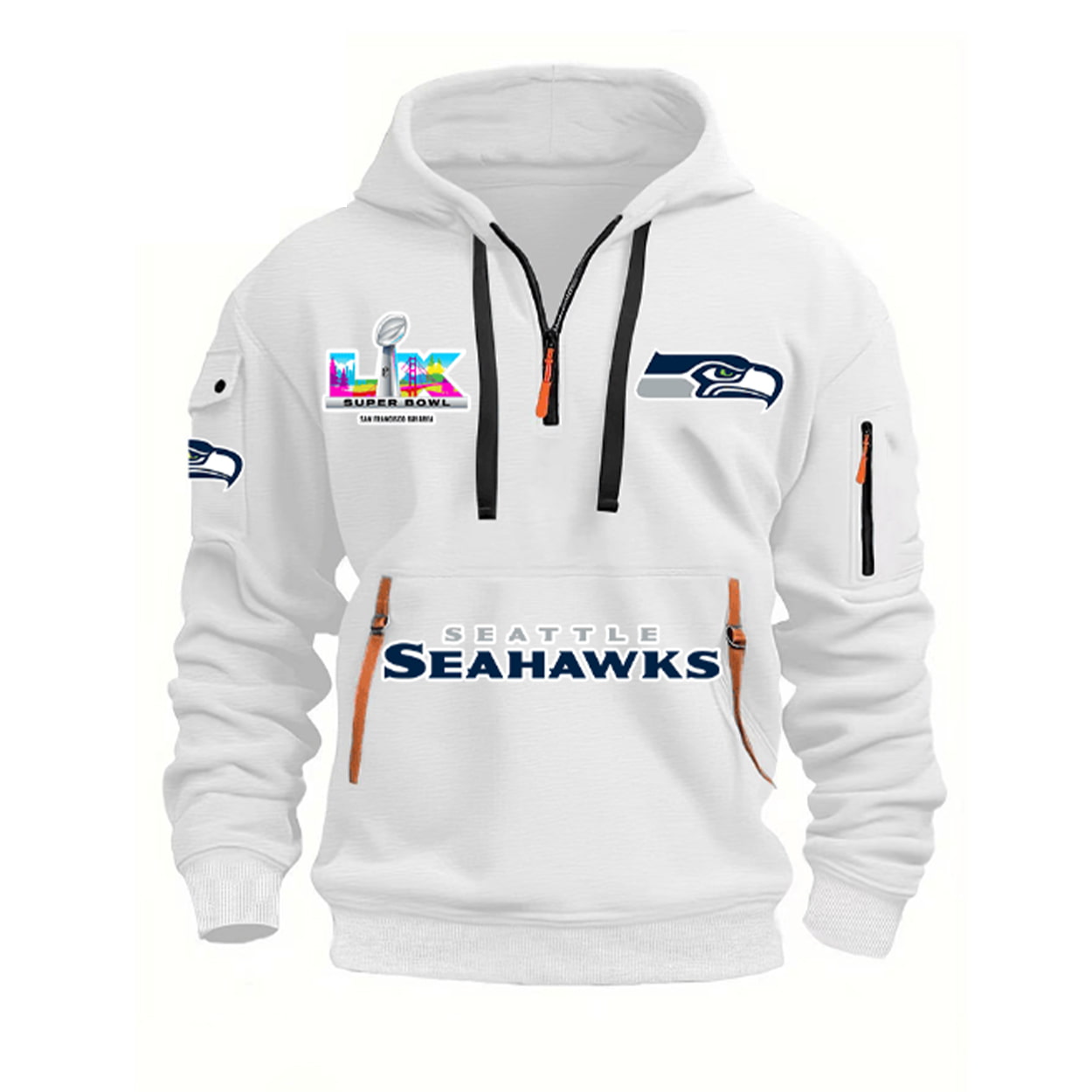 Gear up for Seahawks supremacy with the “Super Bowl LX Quarter Zip Hoodie,” a premium black pullover designed for championship vibes. The front boasts the colorful “LX Super Bowl San Francisco” logo on the left chest, flanked by the Seahawks helmet patch on the sleeve and bold “Seahawks” text across the bottom with yellow accents for dynamic energy, while the overall design includes utility pockets and zipper details without overwhelming extras to spotlight the victory theme.
