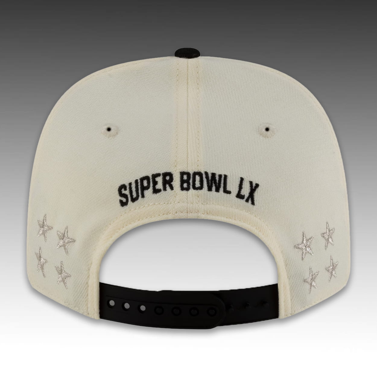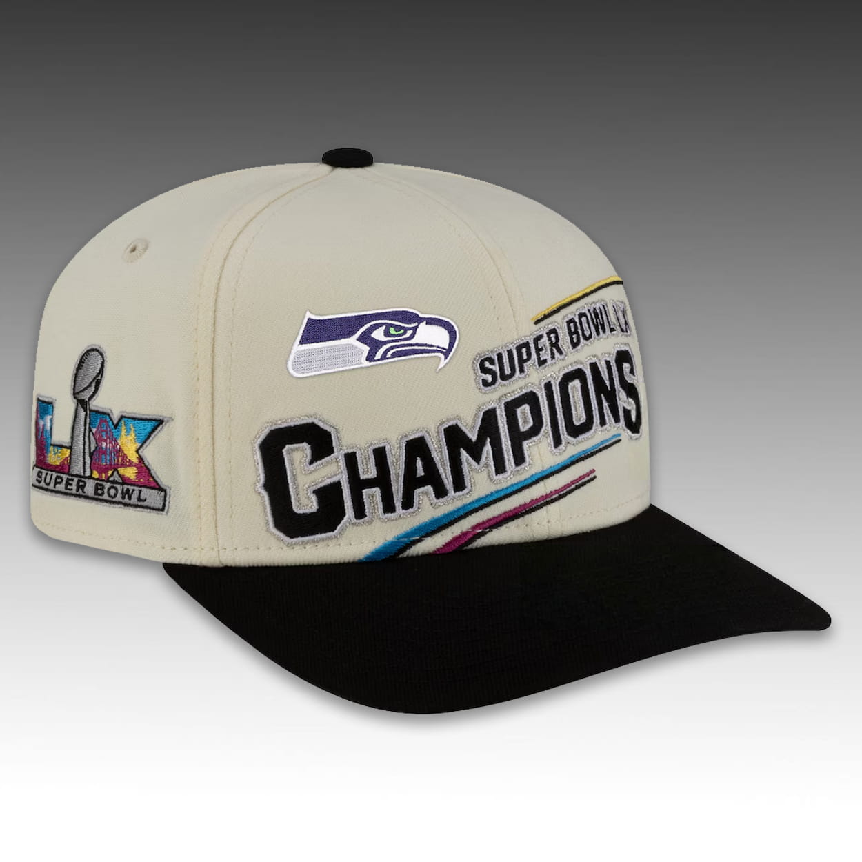 Elevate your championship fit with this distinctively designed Seahawks Snapback. Moving away from standard team colors, this cap features a sophisticated cream (off-white) crown paired with a sharp black visor for a retro-modern look. The front panel is dominated by large, textured “CHAMPIONS” embroidery in black with silver outlining, sitting beneath the Seahawks logo and “SUPER BOWL LX” text. Distinctive details include the Super Bowl LX side patch featuring the Golden Gate Bridge motif, and four embroidered silver stars flanking the “Super Bowl LX” text on the rear panels.