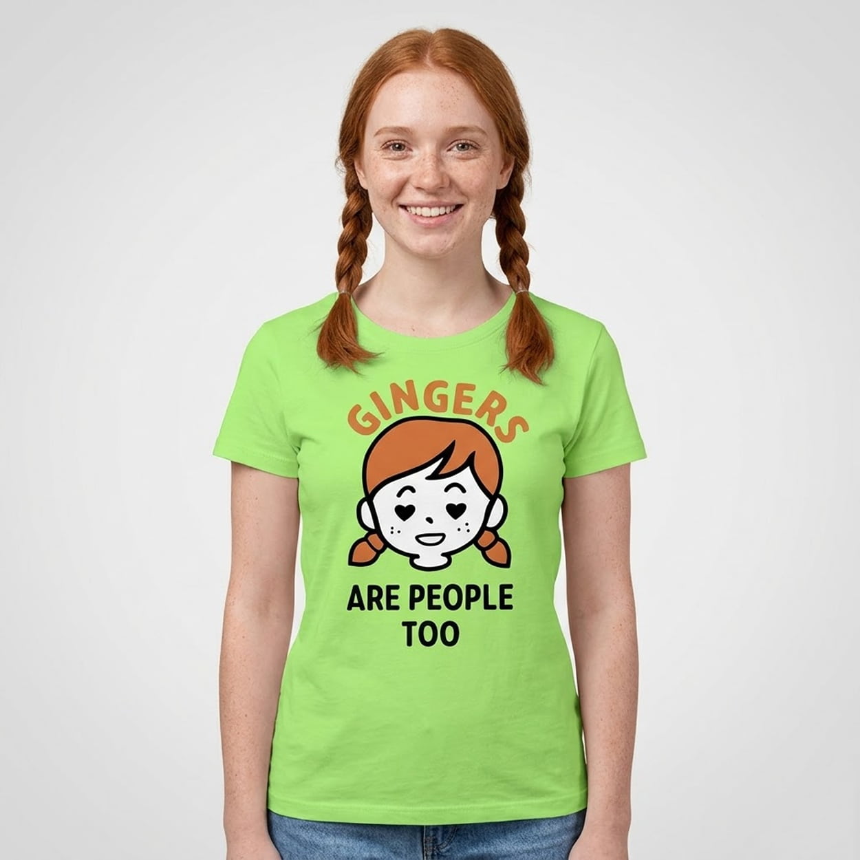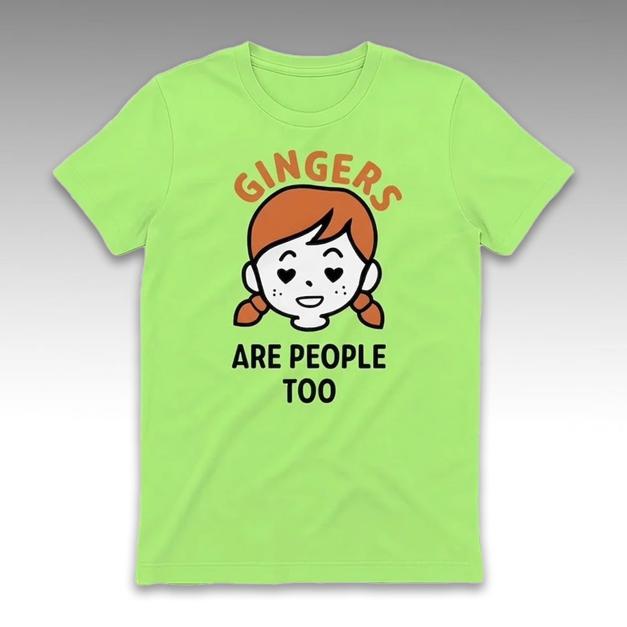 Make a fun, quirky statement with the Shrinking Summer Gingers Are People Too Shirt. This tee features a playful, cartoon-style illustration of a smiling girl with red hair styled in pigtails, prominent freckles, and charming heart-shaped eyes. Anchoring the character art is the bold, arched text “GINGERS” displayed above her head, while the punchline “ARE PEOPLE TOO” sits directly below in stark, solid typography. The design perfectly balances a lighthearted, retro-inspired aesthetic with straightforward, humorous messaging.