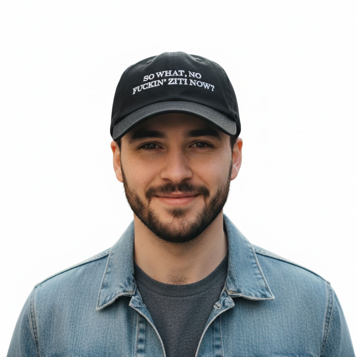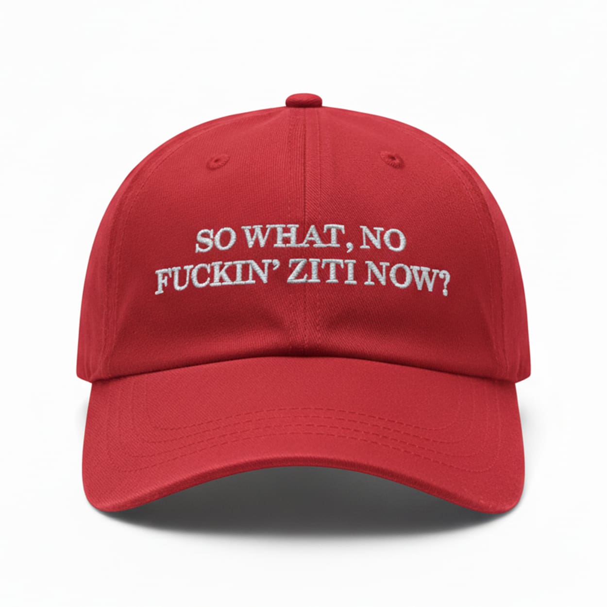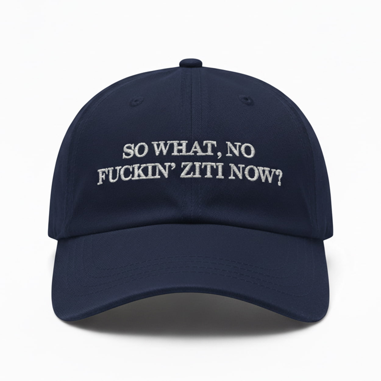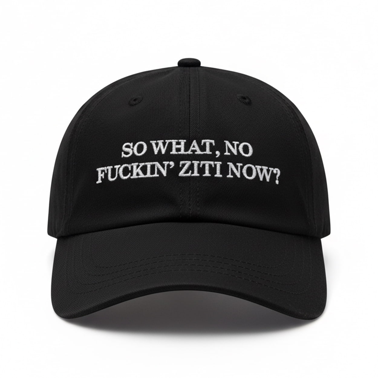 This cap makes a legendary statement with just one iconic question. It features the famous quote “SO WHAT, NO FUCKIN’ ZITI NOW?” embroidered in clean, white, sans-serif font. The minimalist “dad hat” design puts the entire focus on the words, making it an unmistakable tribute to one of the most famous lines in television history.