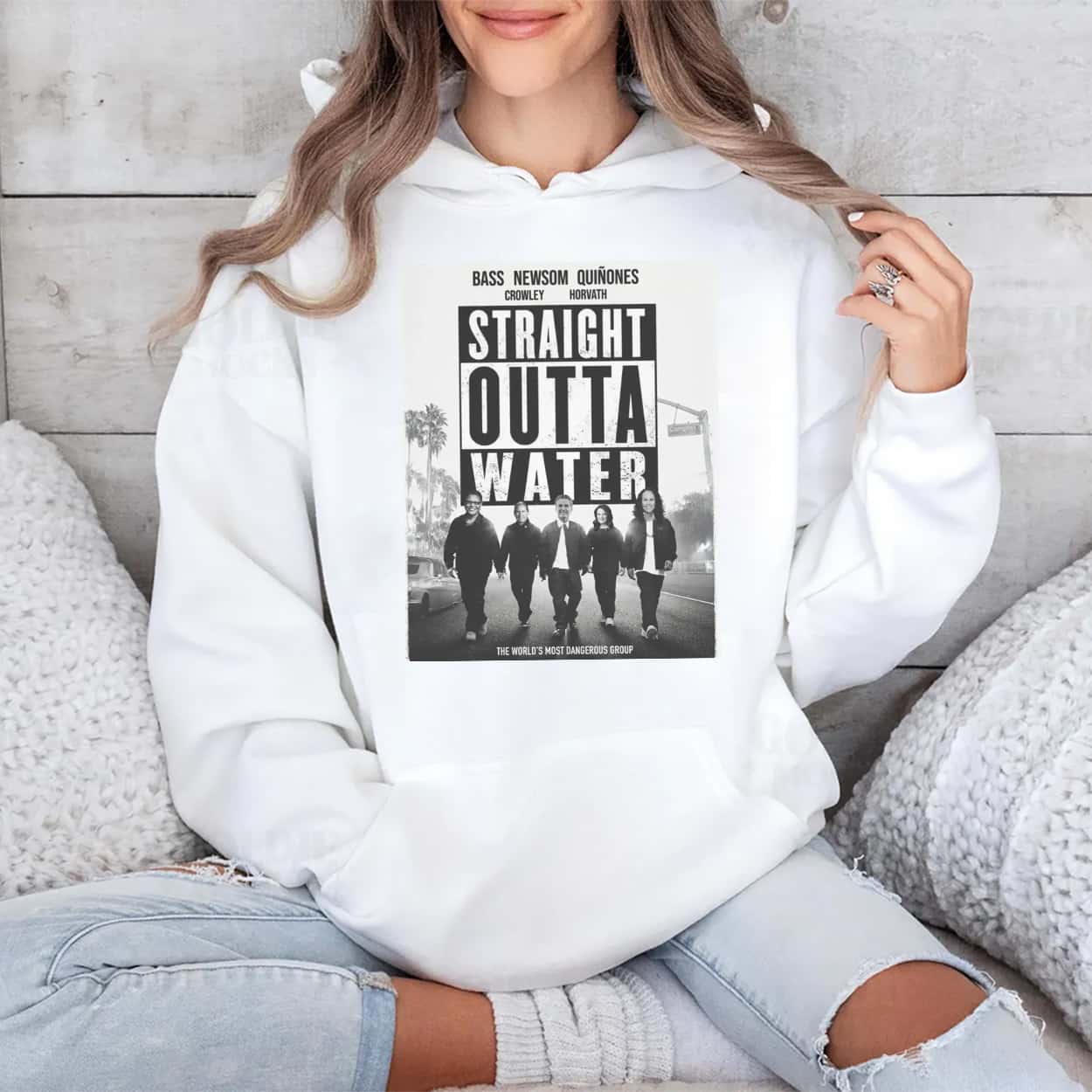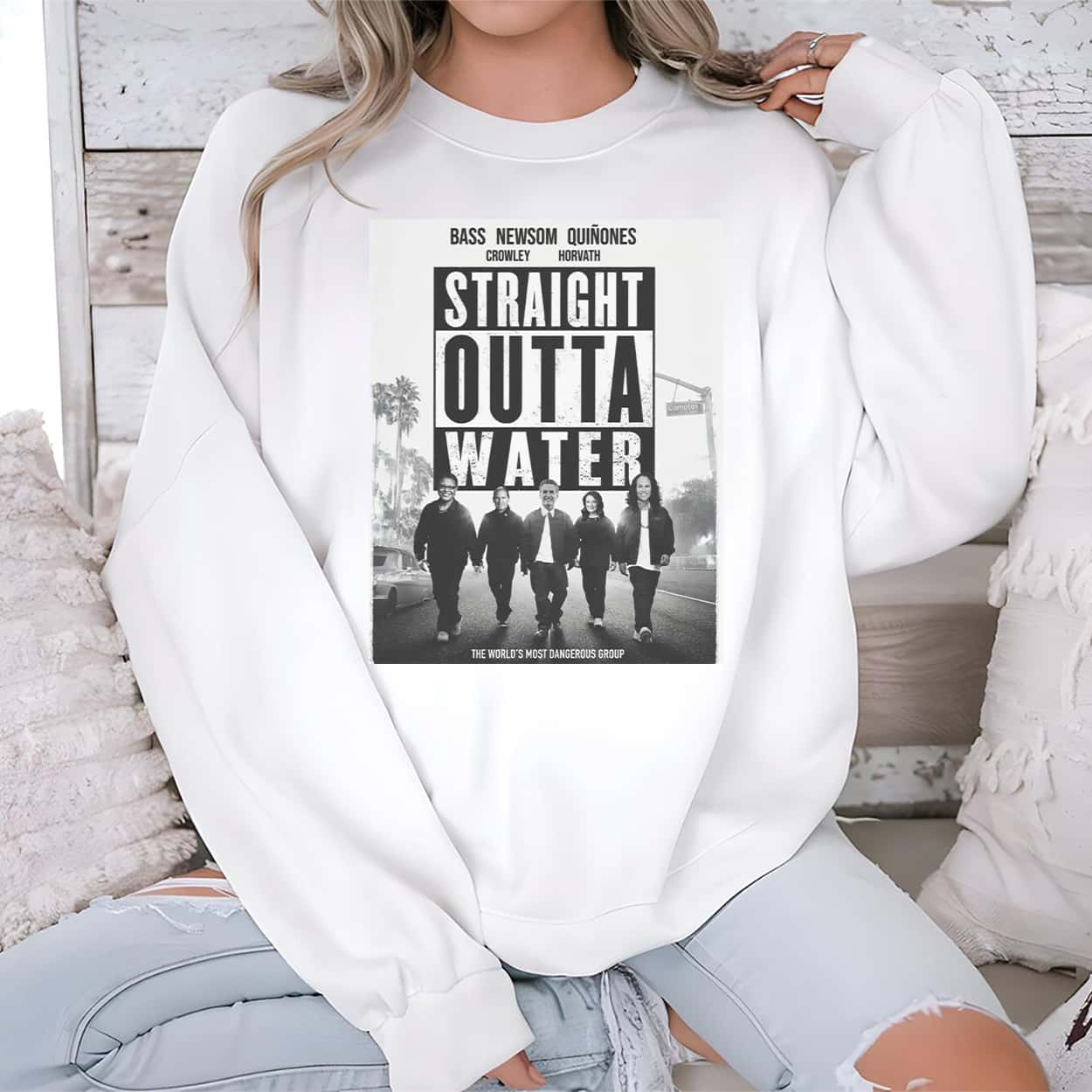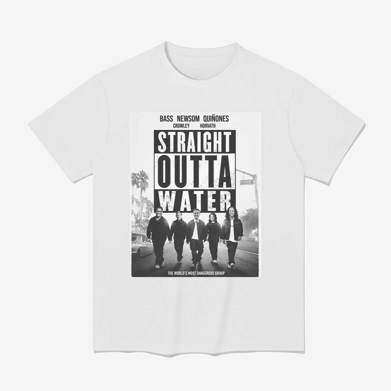 This t-shirt is the ultimate “if you know, you know” piece of pop culture memorabilia. The design is a brilliant parody of the iconic “Straight Outta Compton” album cover. It features the bold, unmistakable text “STRAIGHT OUTTA WATER” above a black-and-white photo of the “World’s Most Dangerous Group”: MWD board members and California politicians, including Bass, Newsom, Quiñones, Crowley, and Horvath, walking down a street in N.W.A. style.