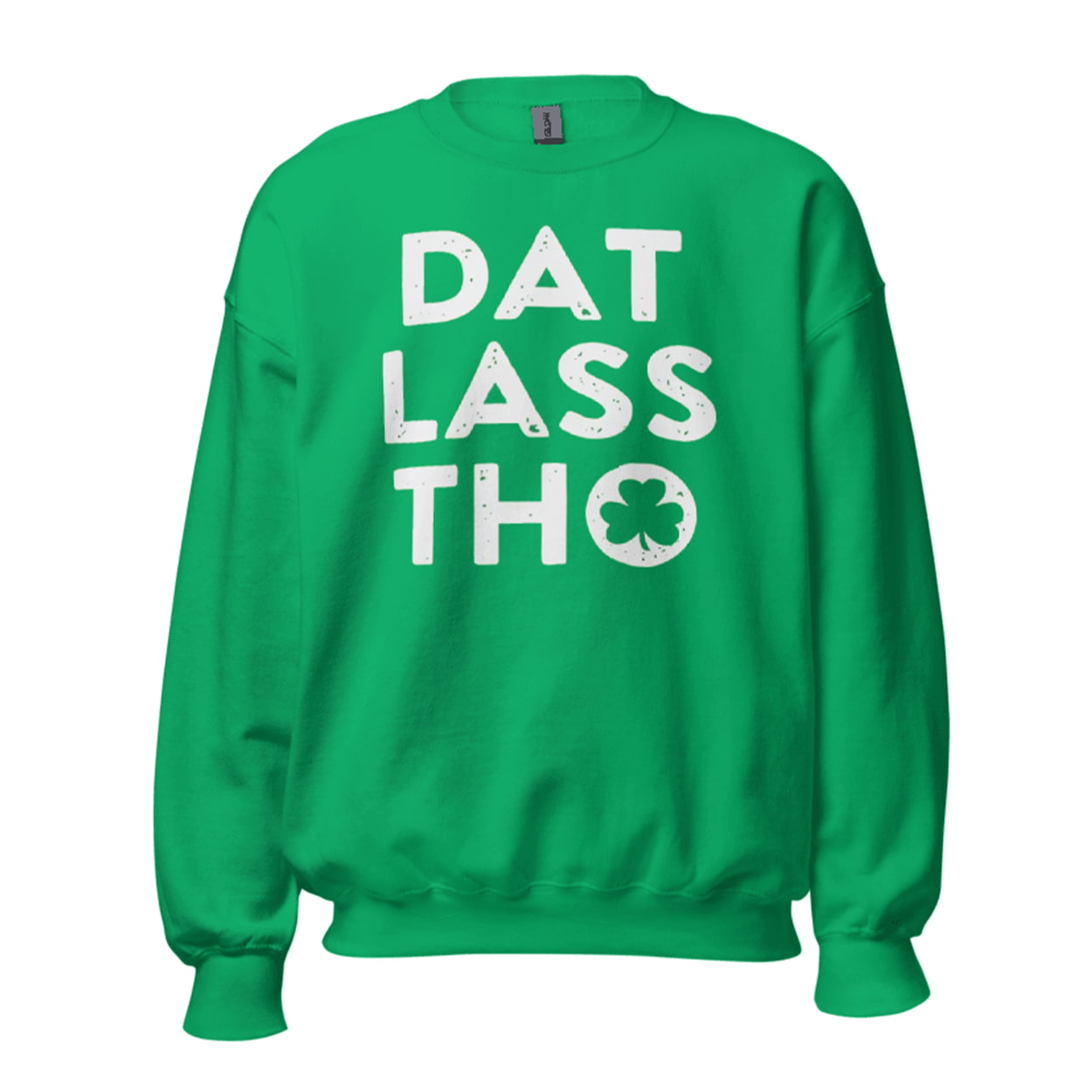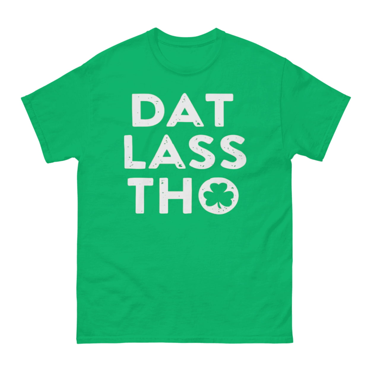 Get festive with the St Patrick’s Day Dat Lass Tho Shirt, a humorous tee playing on modern slang with an Irish twist. The design centers “DAT LASS THO” in bold, distressed white lettering, with a shamrock replacing the “O” for thematic flair, without extra graphics to keep the focus on the clever pun.