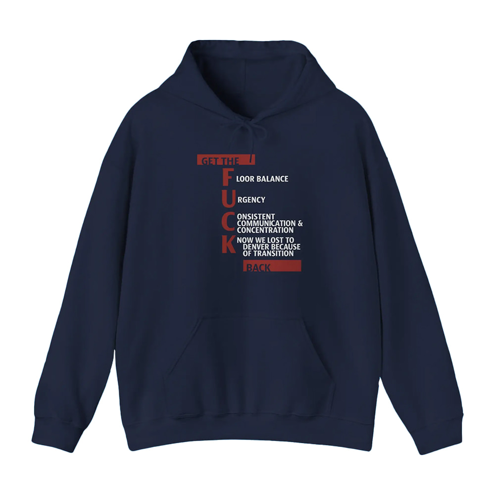 This shirt is built for comfort and makes a bold statement. The prominent printed graphic showcases the coach’s intense demand to “GET THE F*** BACK” on defense. Each letter of the key word details a specific instruction for success: Floor Balance, Urgency, and Consistent Communication & Concentration.