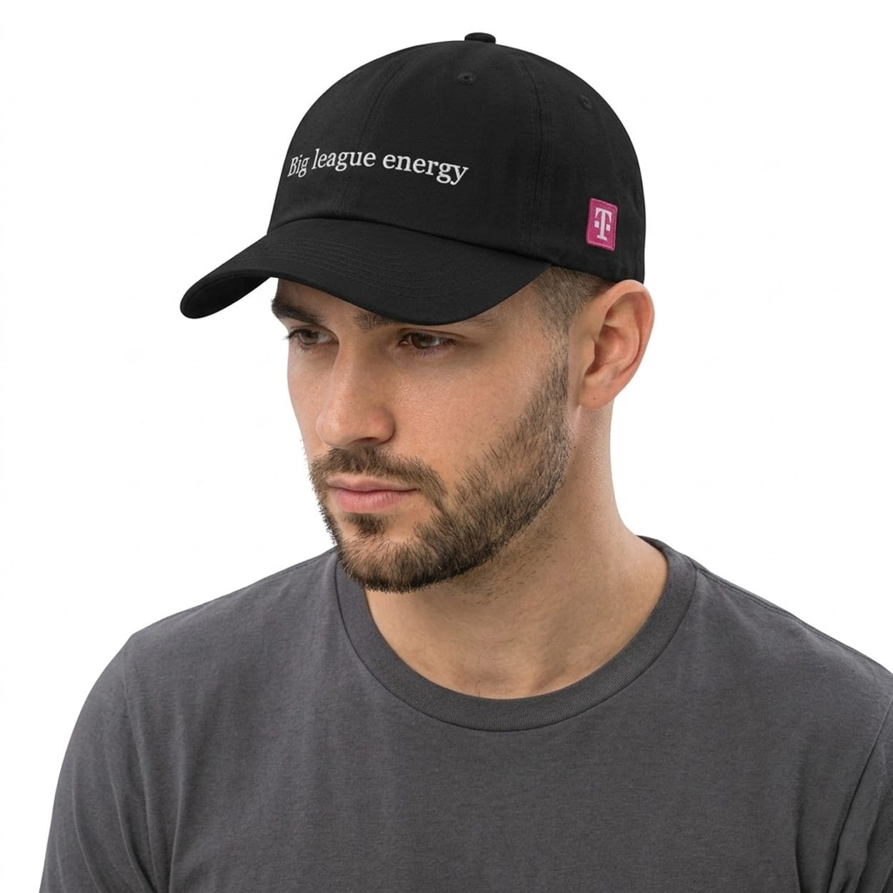 Make a confident statement with the “Big league energy” typography embroidered directly across the front panels. The design is completed by the recognizable T-Mobile square logo patch on the side panel, perfectly blending corporate branding with a fun, confident stadium-ready aesthetic.