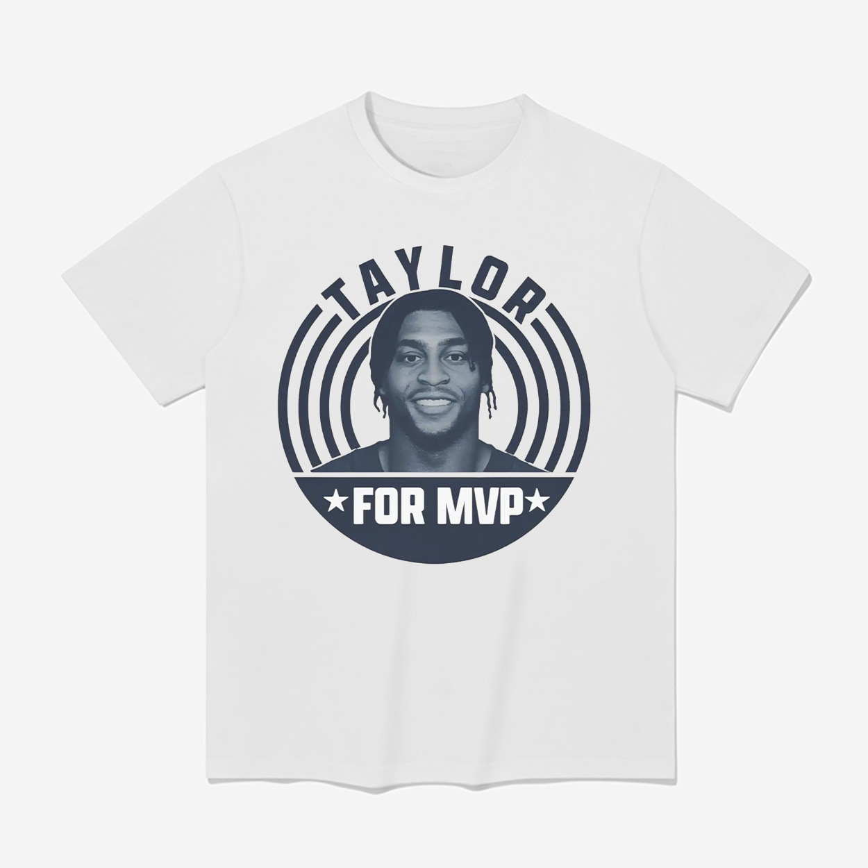 This premium white t-shirt is the perfect “campaign” apparel for the 2025 season. It features a clean, retro-style logo in classic Colts blue. The design is styled like a political button, with “TAYLOR” arched over a duotone portrait of Jonathan Taylor, and a bold “FOR MVP” banner just below, making your allegiance clear.