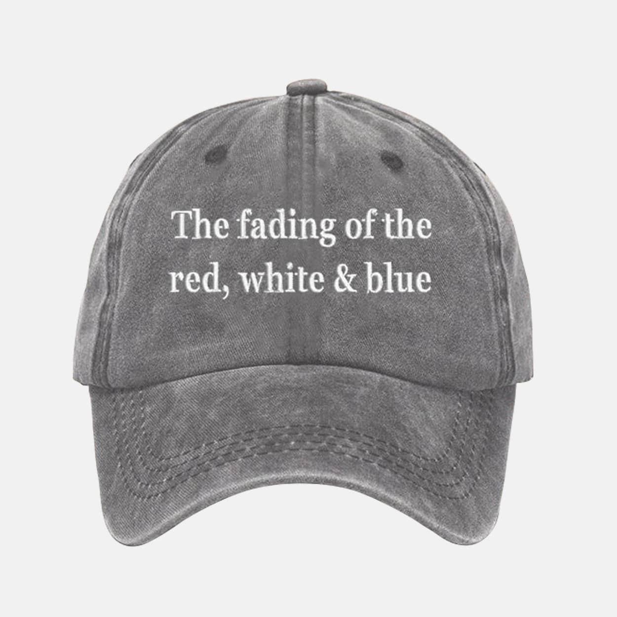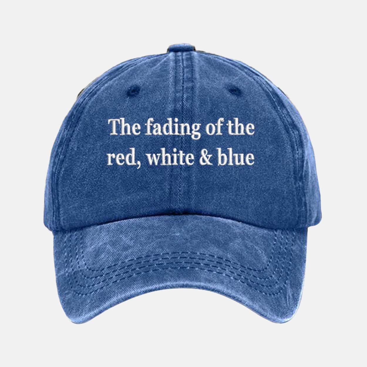 This baseball cap features the phrase “The fading of the red, white & blue” embroidered prominently on the front. The hat’s faded blue color and relaxed, curved-brim design offer a comfortable, worn-in look, complementing the garment’s thematic focus. It includes an adjustable strap for a universal fit.