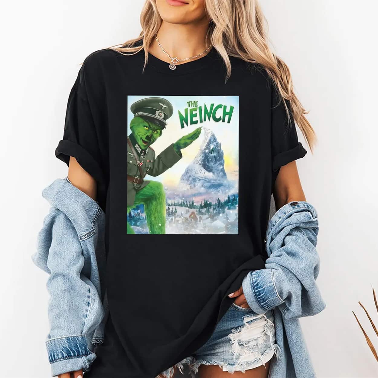 Make a bold and controversial statement with this The Neinch Shirt. The design features a realistic, green-furred character dressed in a detailed vintage grey military officer’s uniform, complete with a peaked cap and tactical belt. He gestures toward a twisted, snowy mountain peak under the bold, green title text “THE NEINCH,” creating a sharp visual parody of classic storybook covers.