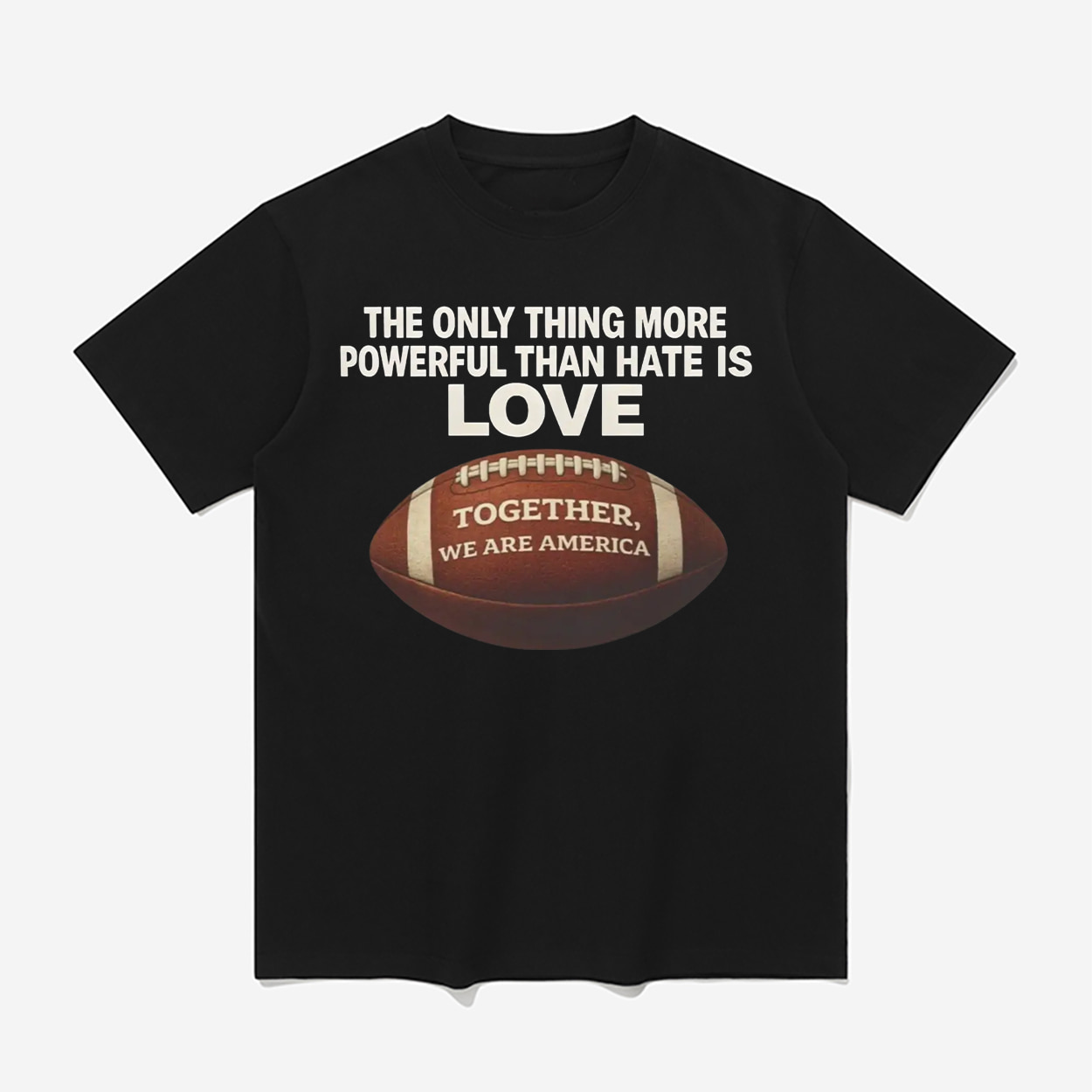 Unite the most iconic visuals of the year with this “Manifesto” Tribute T-Shirt. The design features a bold, high-contrast layout on a premium black tee, centered around the defining quote: “THE ONLY THING MORE POWERFUL THAN HATE IS LOVE,” with the word “LOVE” emphasized in large, impactful typography. Below the text sits a realistic graphic of the “Together, We Are America” football prop, replicating the exact item revealed during the halftime finale to create a cohesive message of solidarity.