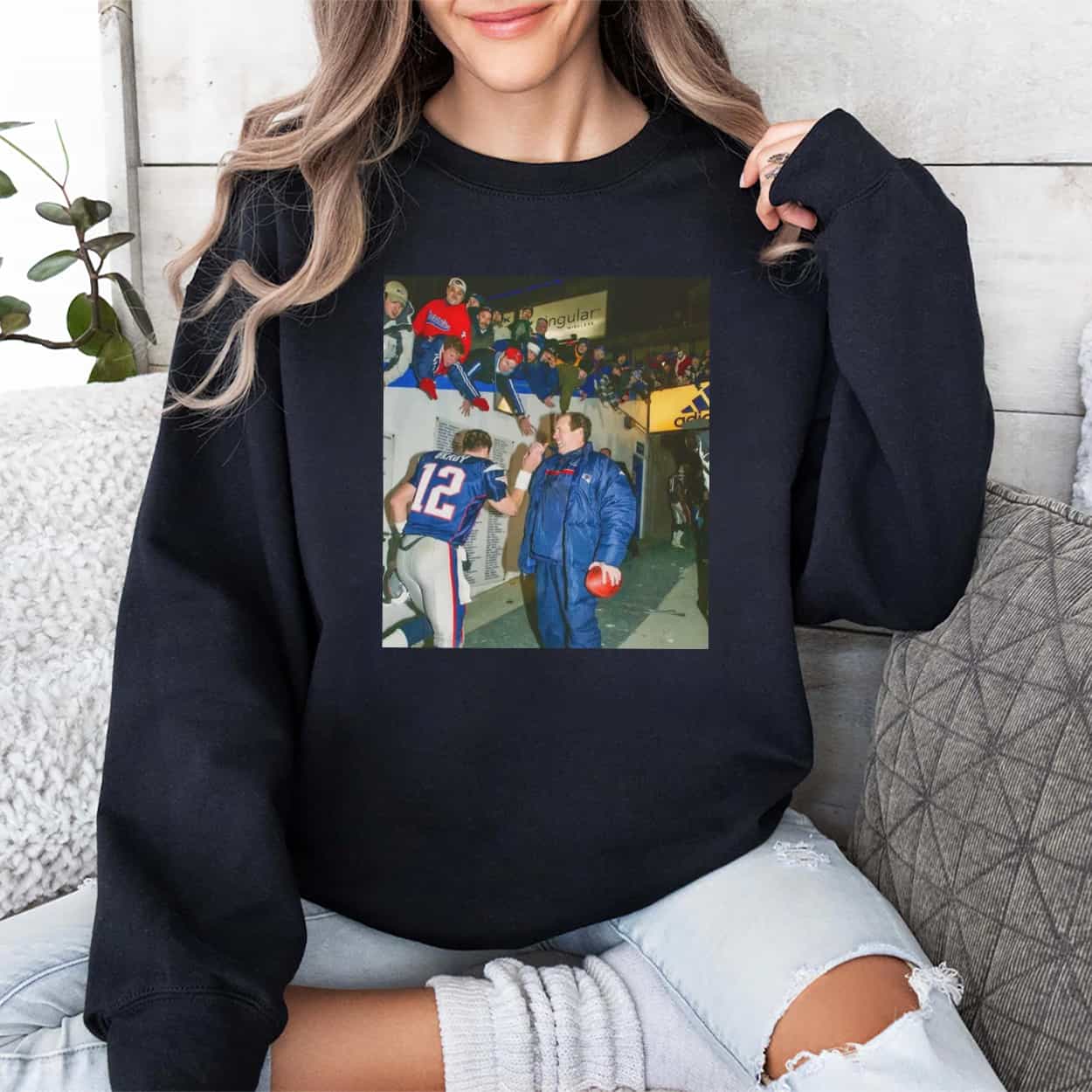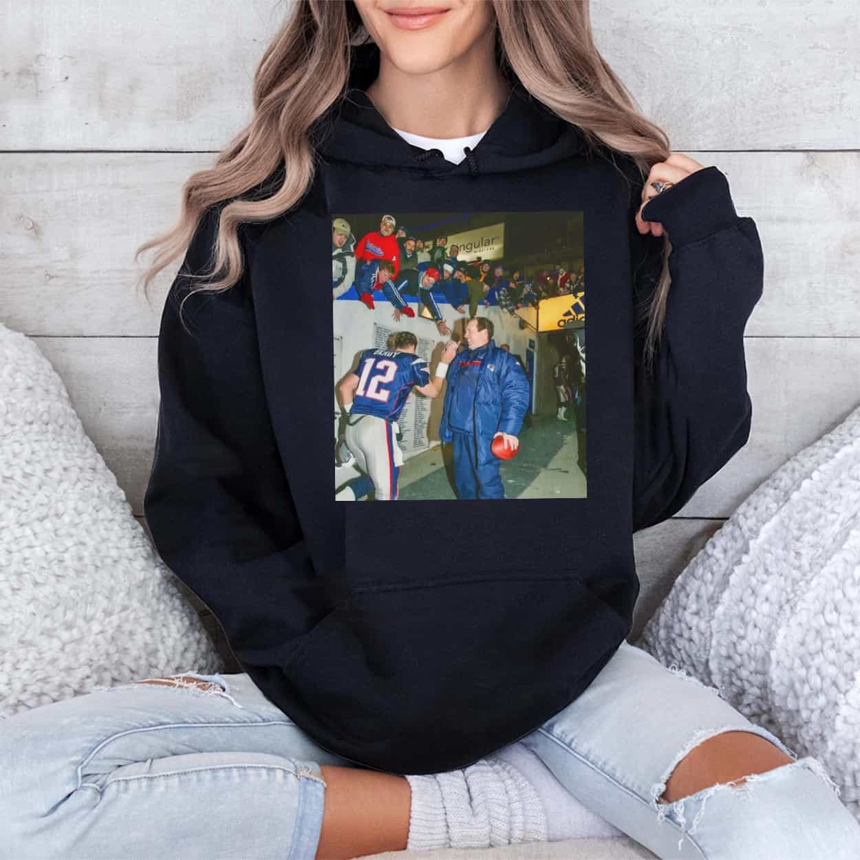 Capture Patriots lore with the Tom Brady And Bill Belichick 2001 Shirt, it showcasing a vintage photo of Brady (#12) consulting Belichick during the snowy AFC Divisional Playoff against the Raiders, with cheering fans in the stands for authentic drama. The design keeps it minimalist, focusing on the high-contrast image without added text or logos to let the moment shine.