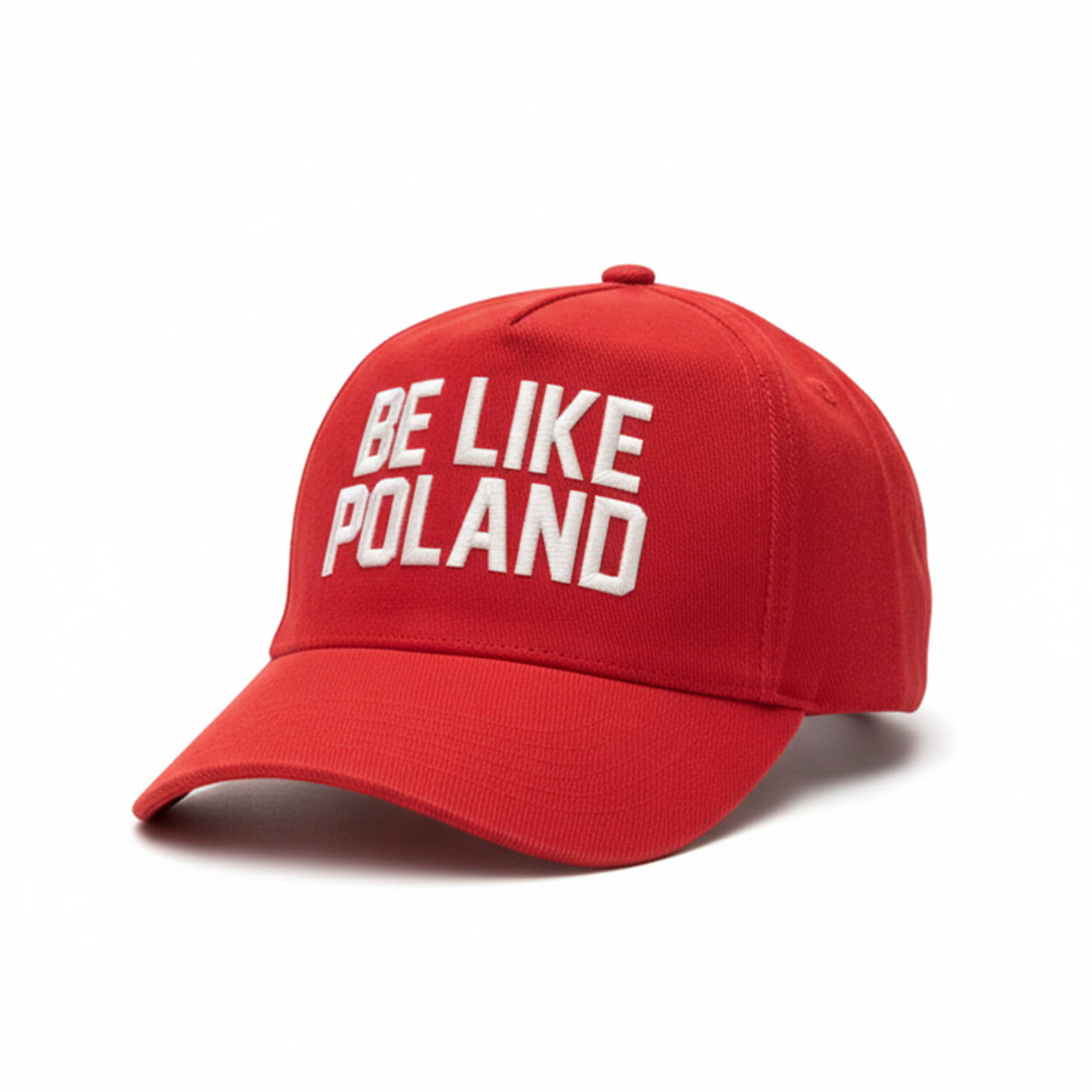 This cap makes a clear and bold political statement. It features a vibrant red base, with the slogan “BE LIKE POLAND” embroidered in a large, bold sans-serif font across the front panels. The design is simple, direct, and instantly recognizable to those who follow the political movement it represents.