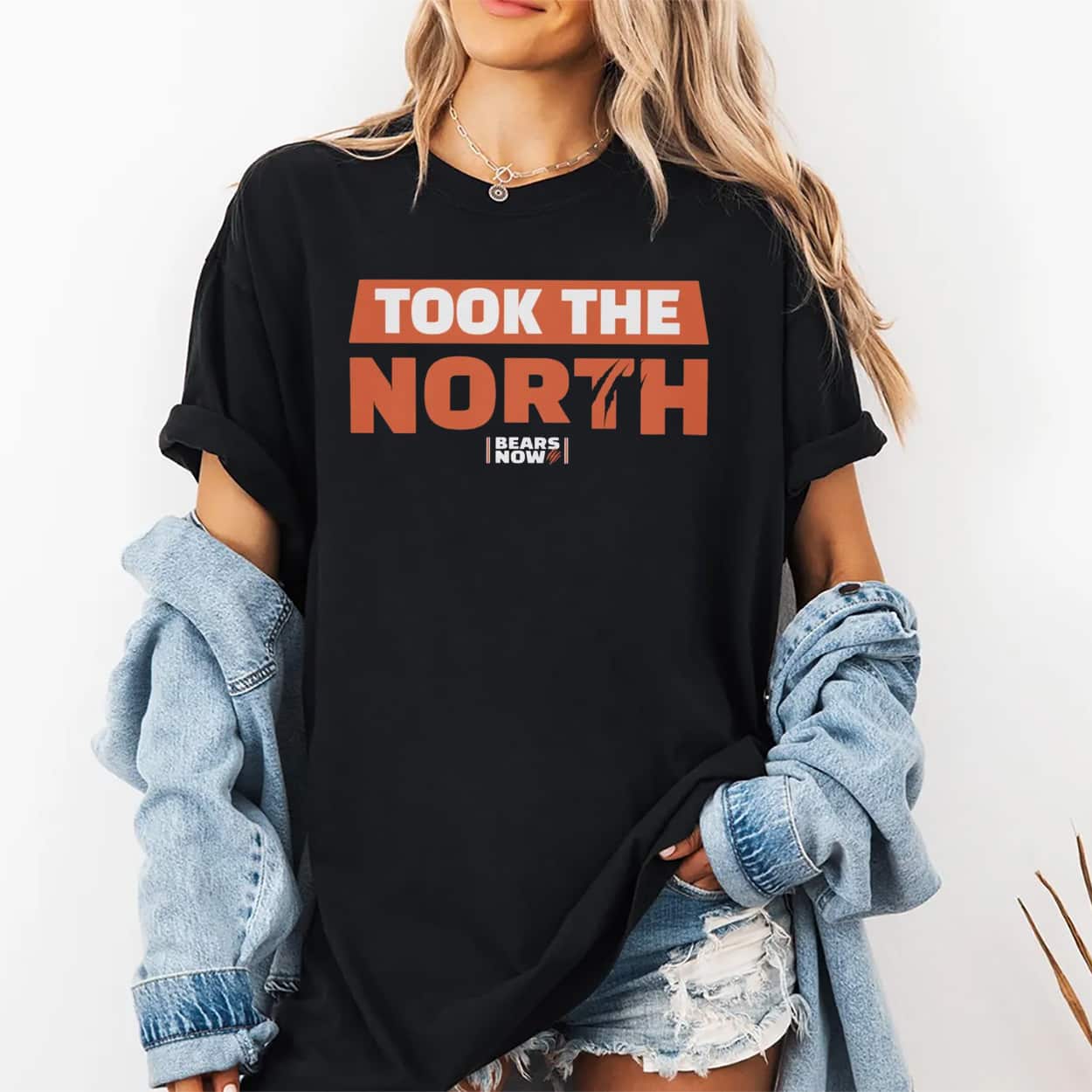 Make a bold statement with this powerful typography tee. The chest is dominated by the massive slogan “TOOK THE NORTH” in the team’s signature orange and white. It features the modern “BEARS NOW” wordmark, accented by a fierce, stylized claw mark that cuts through the text to symbolize the team’s aggressive hold on the division.