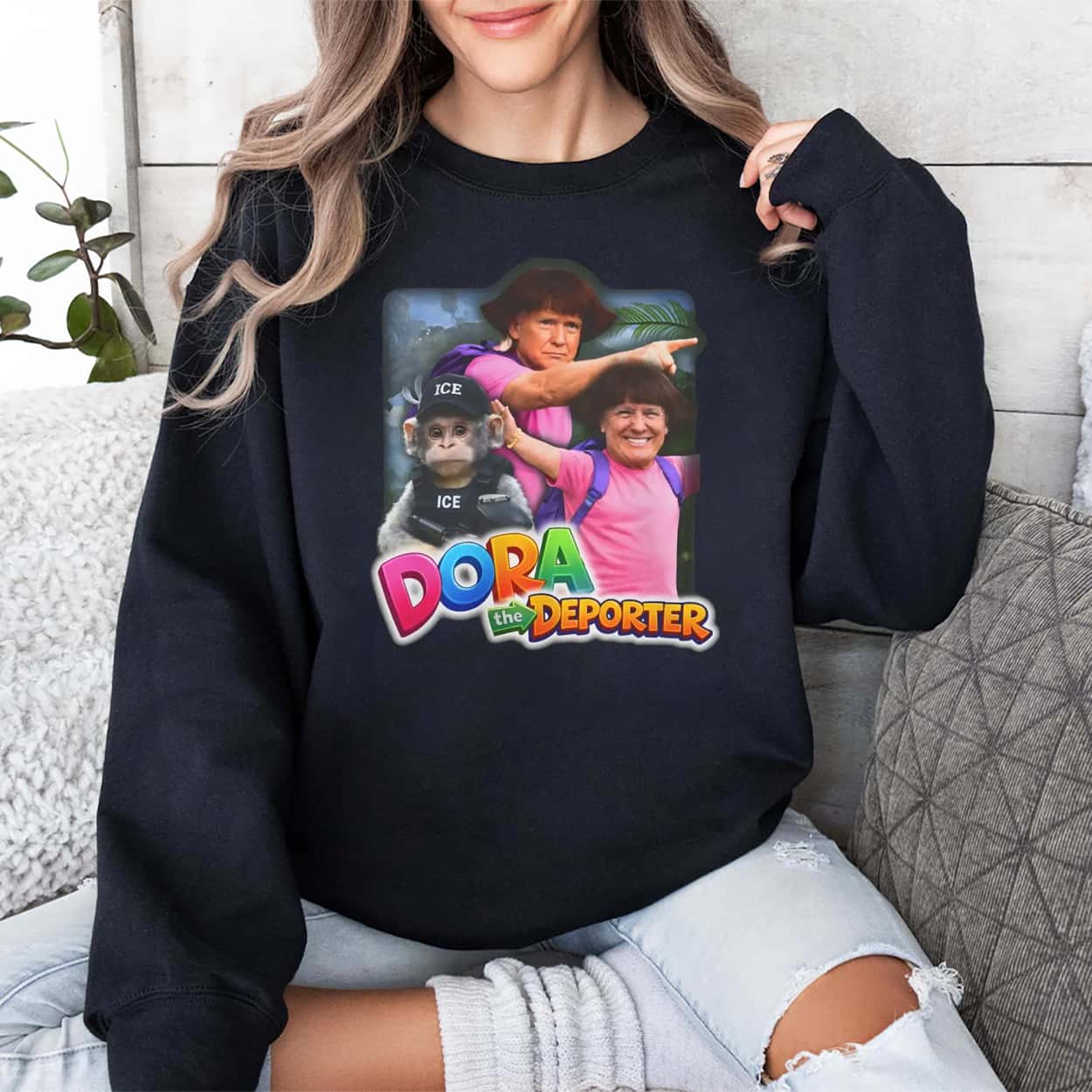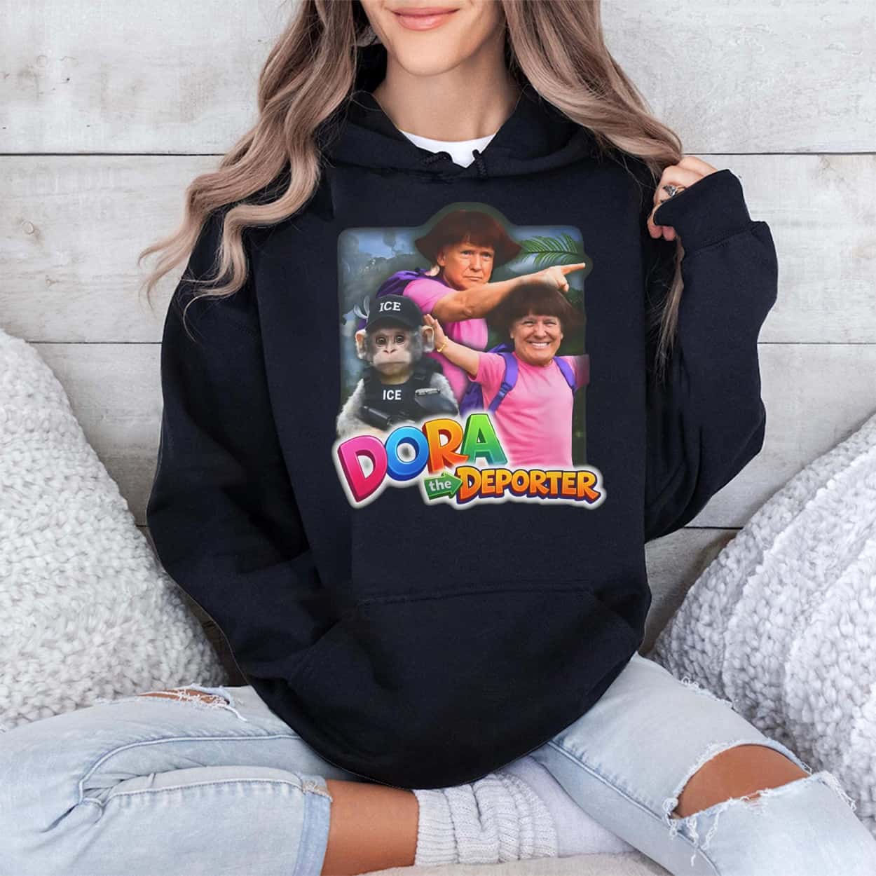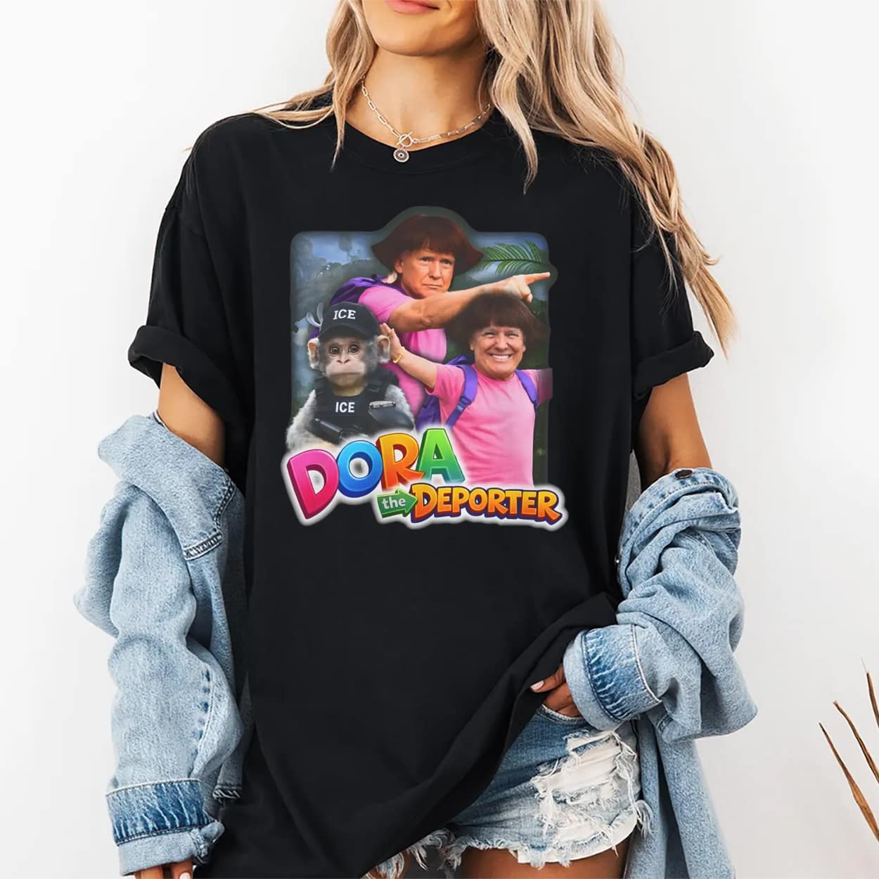 Make a statement that guarantees a double-take with this audacious graphic tee. The design features a vibrant, digitally manipulated image of Donald Trump superimposed onto the body of the famous cartoon explorer, wearing the signature pink shirt and purple backpack. The parody is completed with a sidekick monkey decked out in tactical “ICE” gear, and the playful show logo has been satirically rebranded to read “DORA the DEPORTER” in bright, multi-colored 3D lettering.