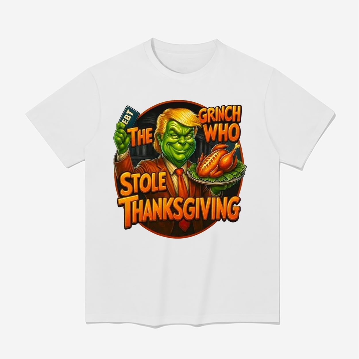 This shirt cleverly merges holiday tradition with modern political satire, turning a beloved Christmas villain into a Thanksgiving symbol of greed and irony. It reflects how politics often intertwines with culture and consumerism, offering a humorous take on national conversations. Whether you see it as political commentary or festive humor, this shirt captures a unique cultural moment with sharp wit and style.