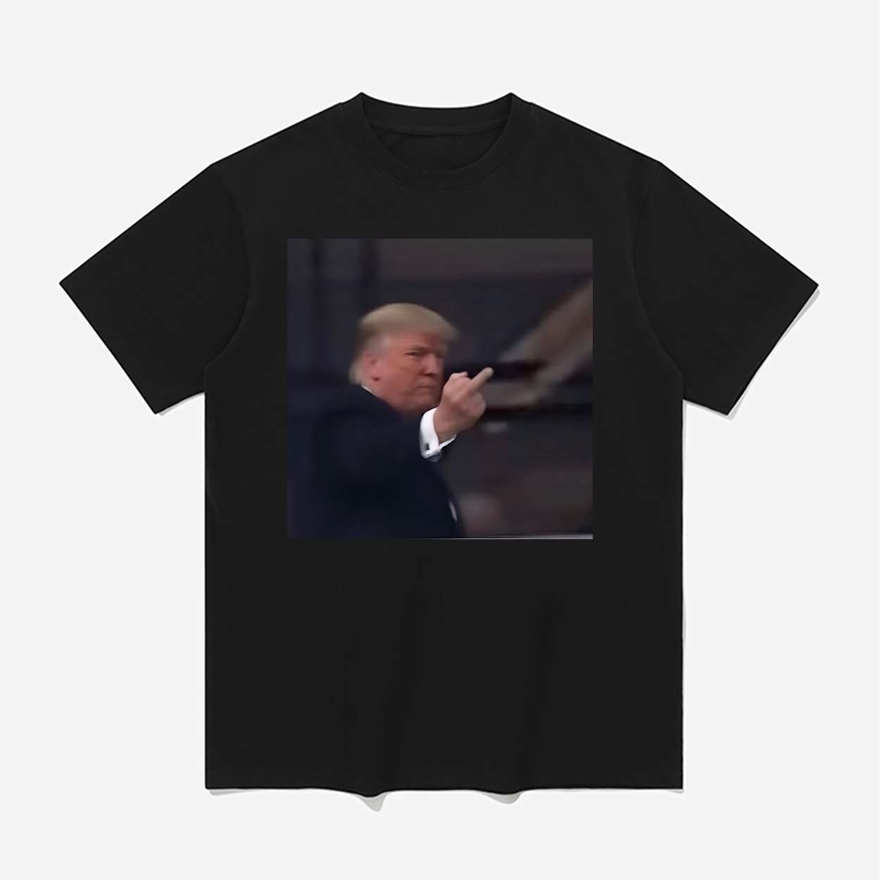 During a Michigan Ford plant visit, Donald Trump responded to a heckler with a raised middle finger. This shirt immortalizes that headline‑making act, reflecting the collision between presidential power, worker frustration, and the spectacle of political theater.